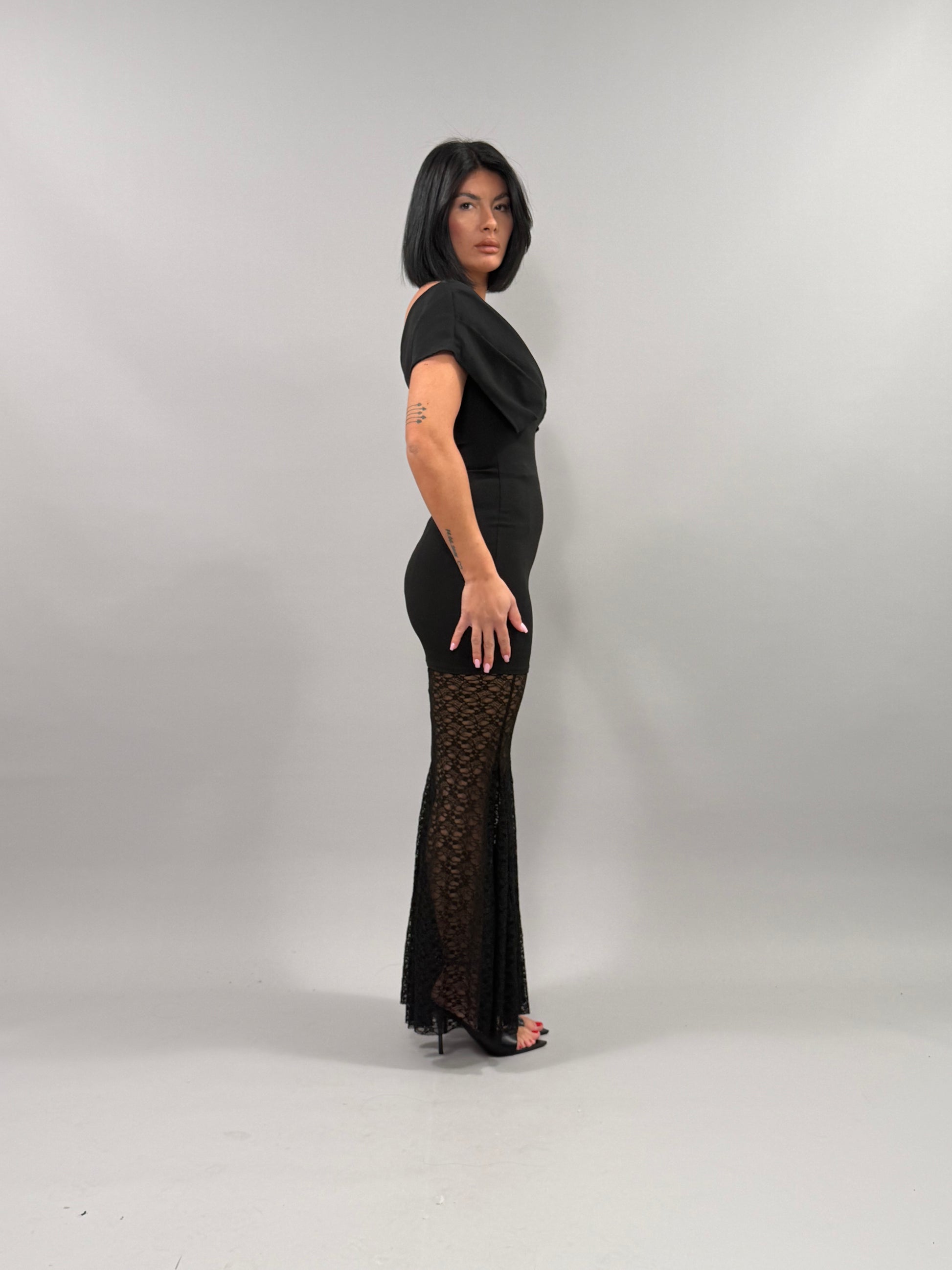 L'Abito Montpellier è disponibile in una elegante variante nera e in taglia unica, progettato per adattarsi a diverse silhouette. Realizzato con materiali di alta qualità, offre comfort e versatilità per varie occasioni. La modella, alta 168 cm, evidenzia come l'abito si adatti perfettamente alla figura.