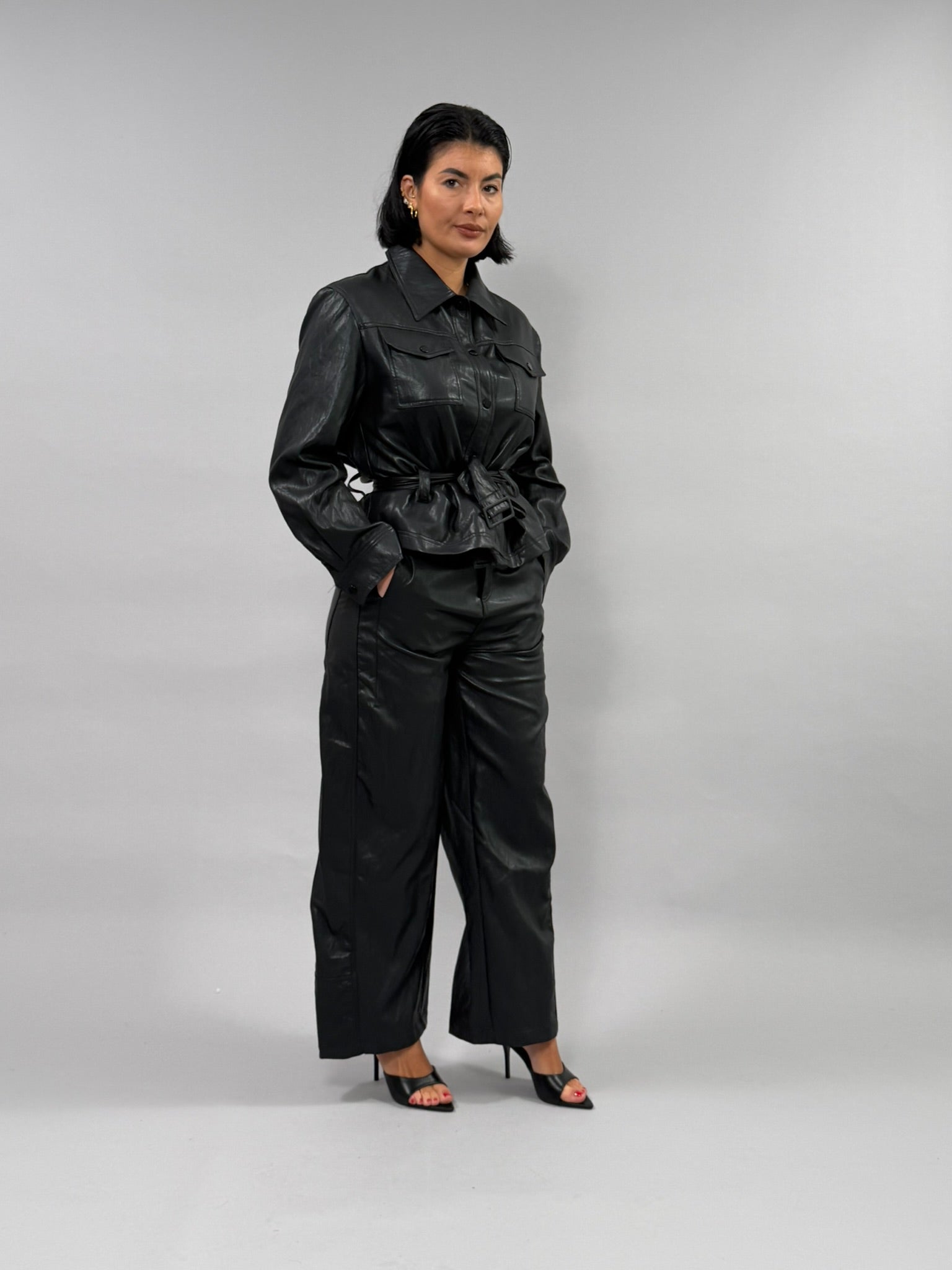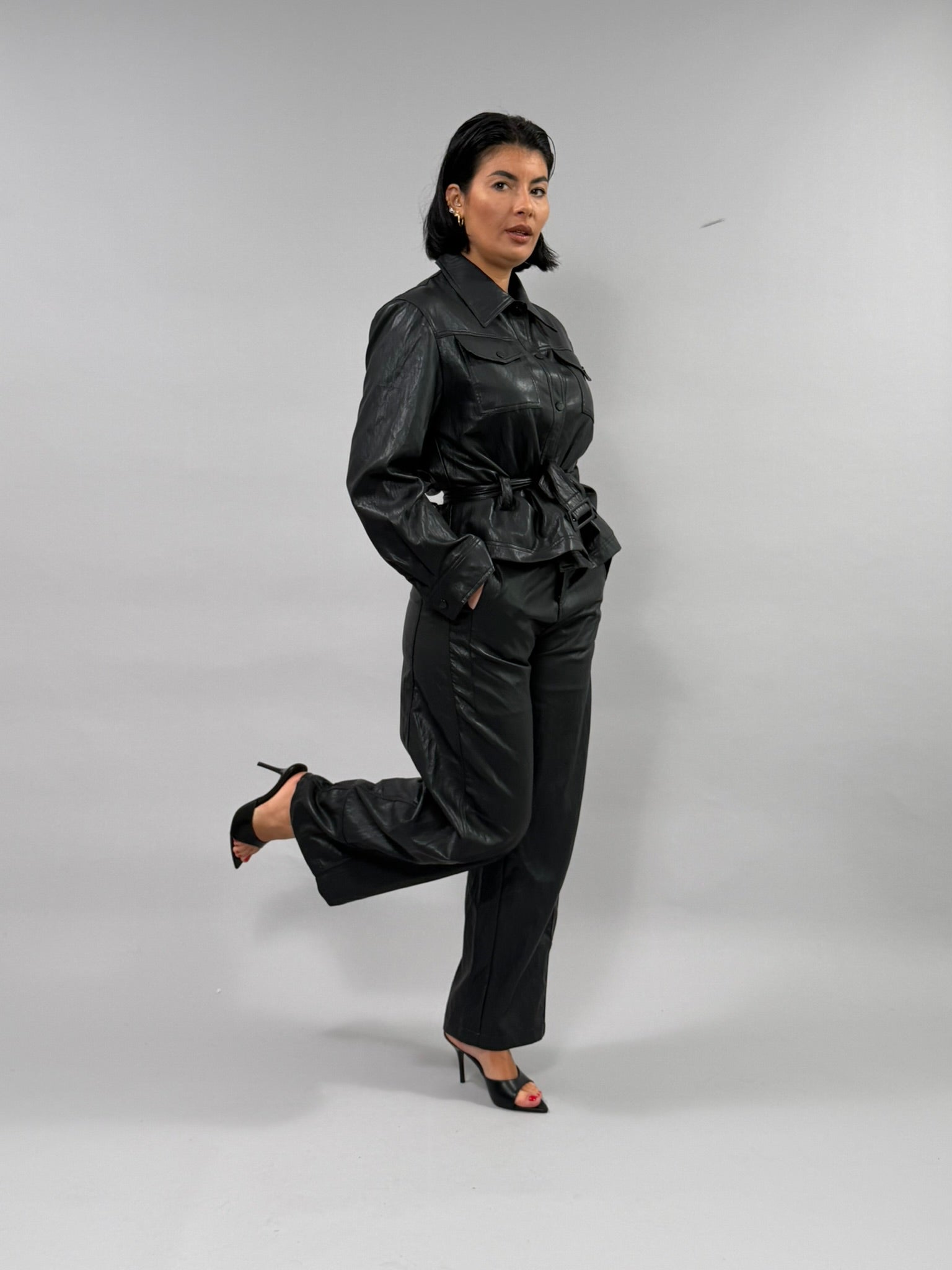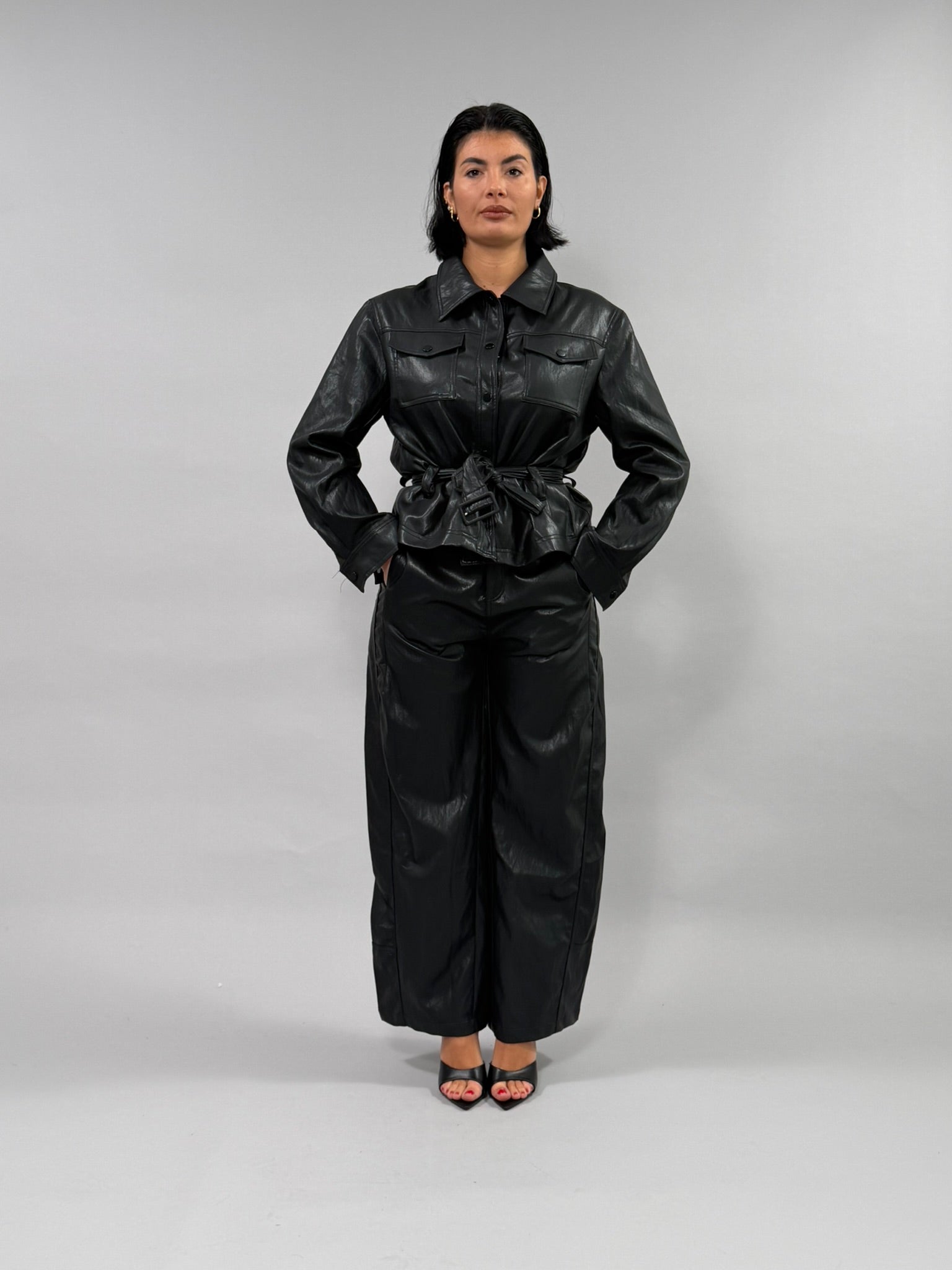 Coordinato Street in materiale misto viscosa e poliestere con effetto pelle sofisticato. Perfetto per uno stile urbano e versatile, questo set combina comfort e eleganza. Disponibile nelle tonalità nero e ghiaccio, dalle taglie S a L. La modella indossa la taglia S. Un'opzione ideale per chi ricerca un look coordinato e moderno.