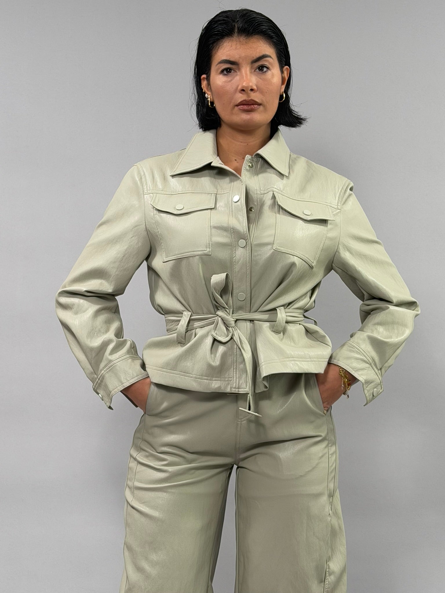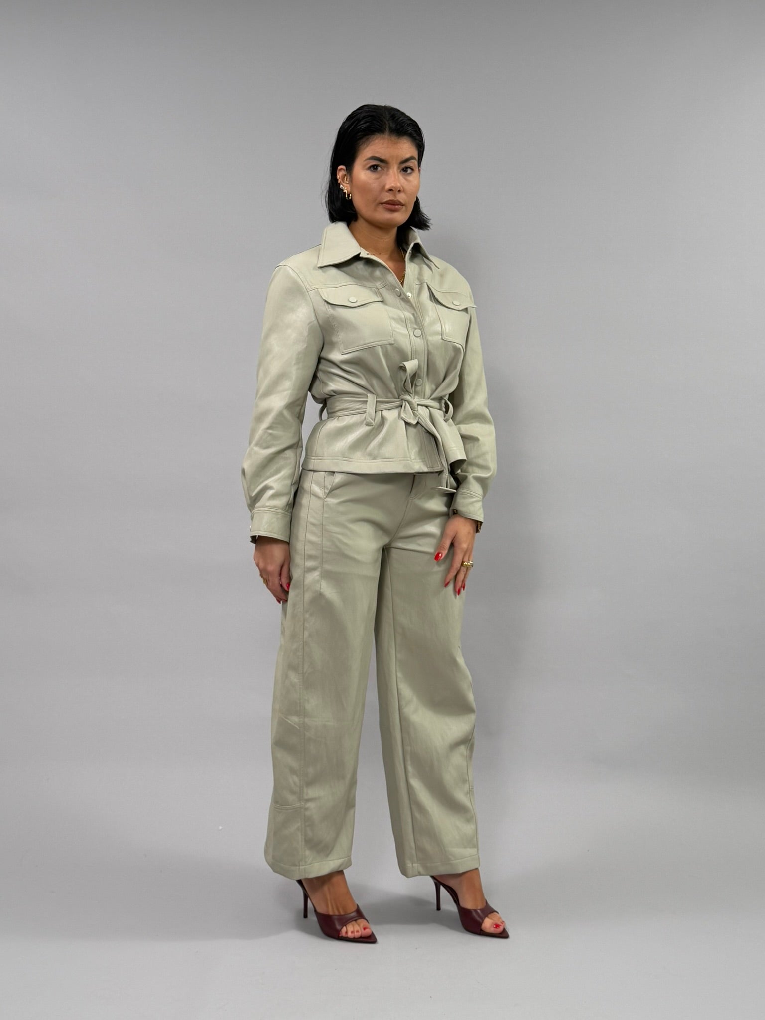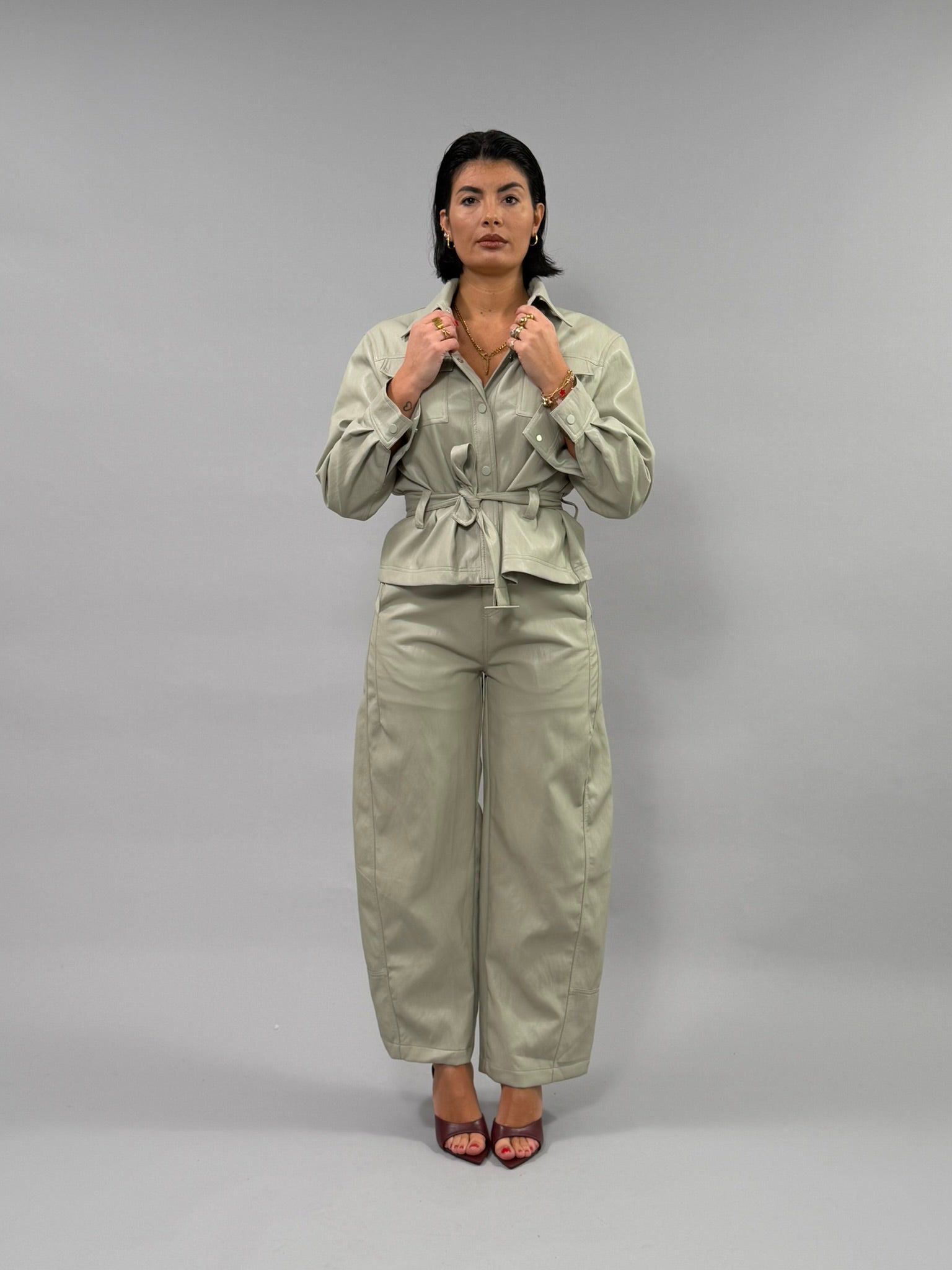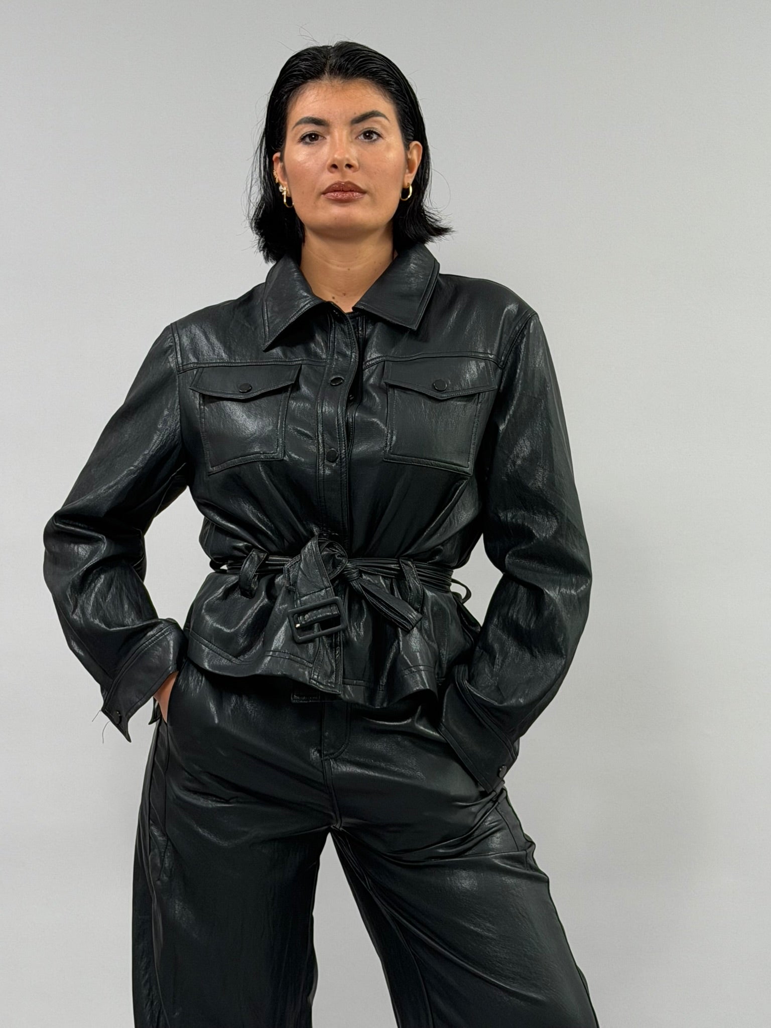 Coordinato Street in materiale misto viscosa e poliestere con effetto pelle sofisticato. Perfetto per uno stile urbano e versatile, questo set combina comfort e eleganza. Disponibile nelle tonalità nero e ghiaccio, dalle taglie S a L. La modella indossa la taglia S. Un'opzione ideale per chi ricerca un look coordinato e moderno.