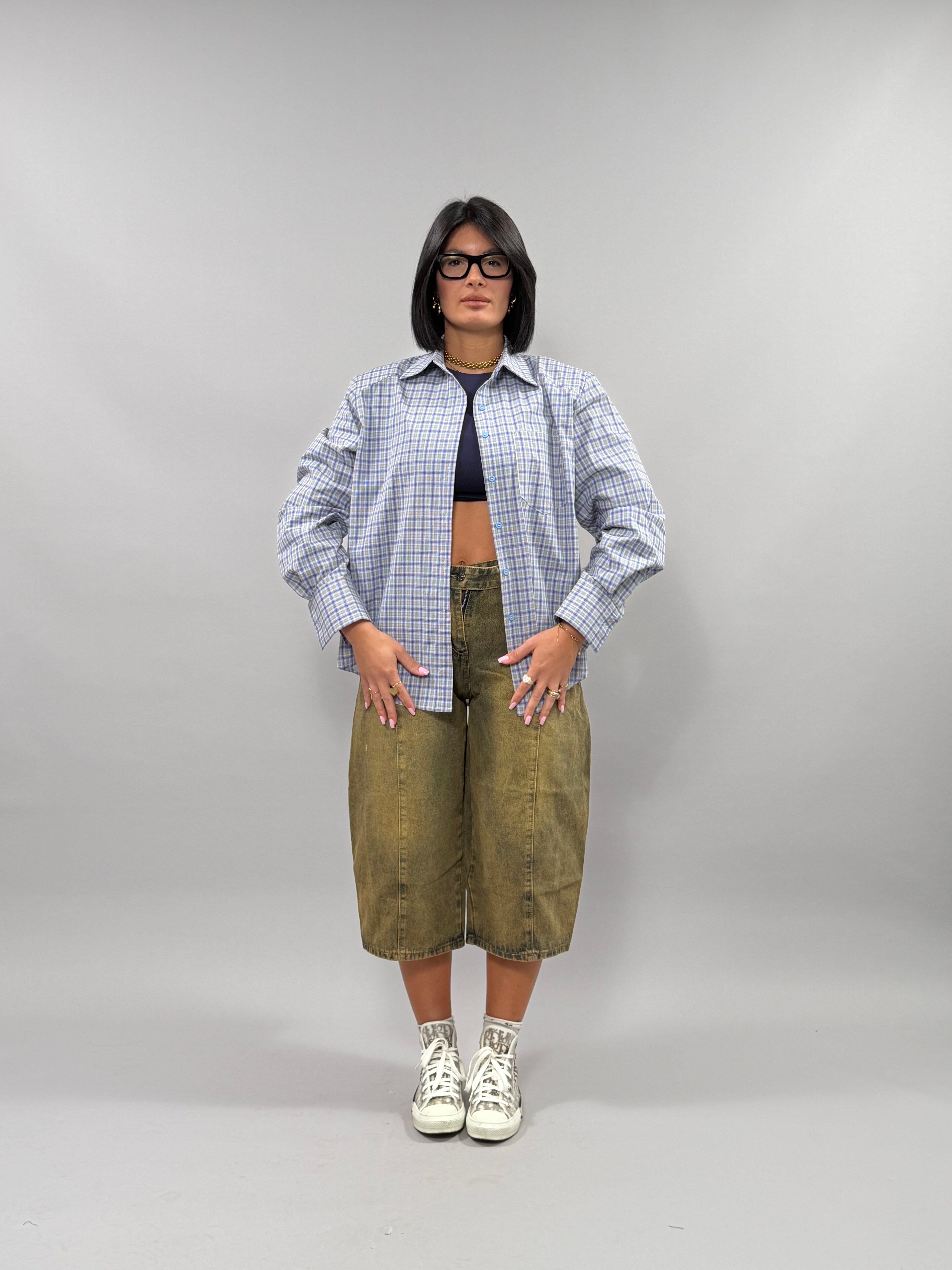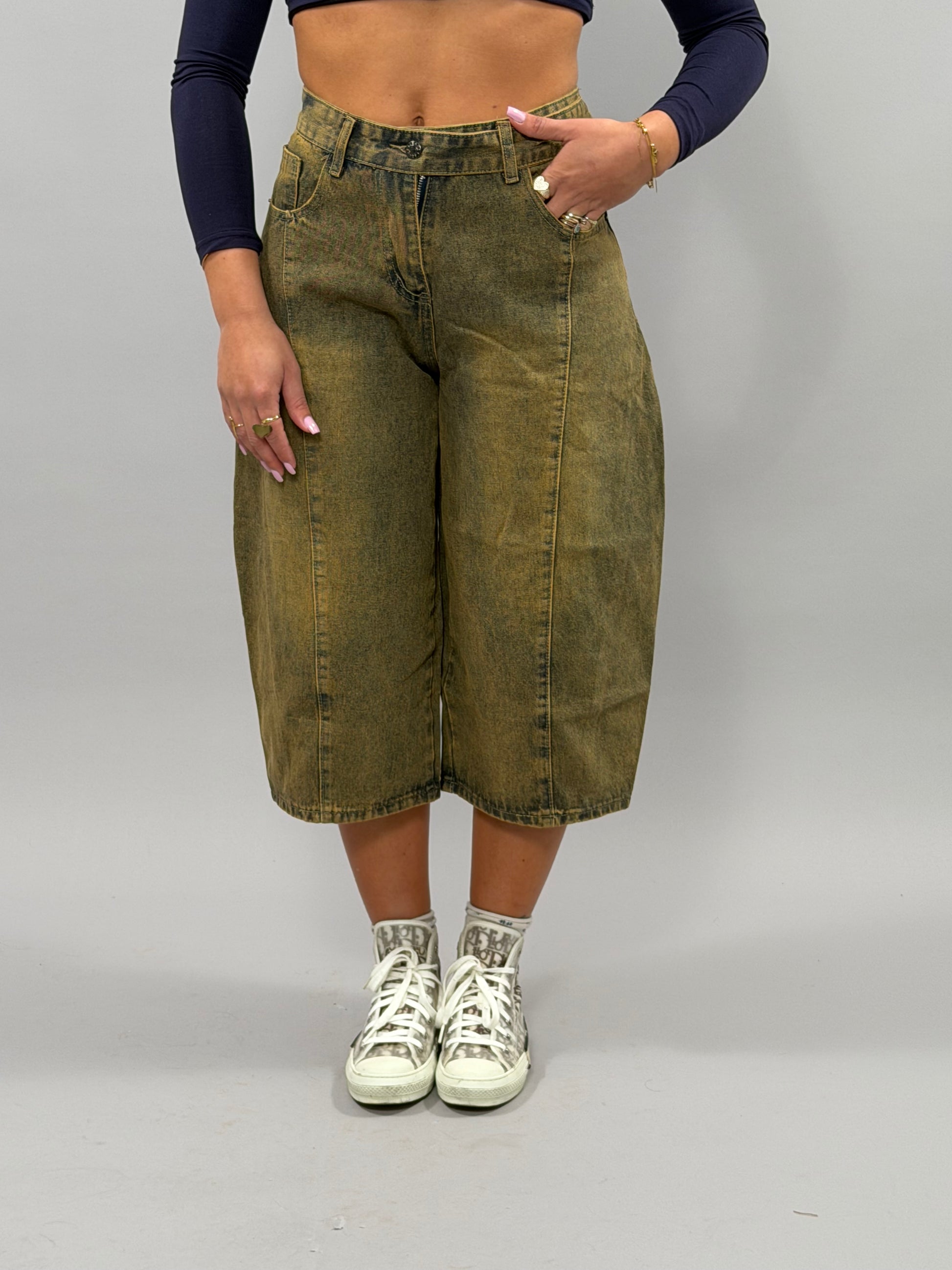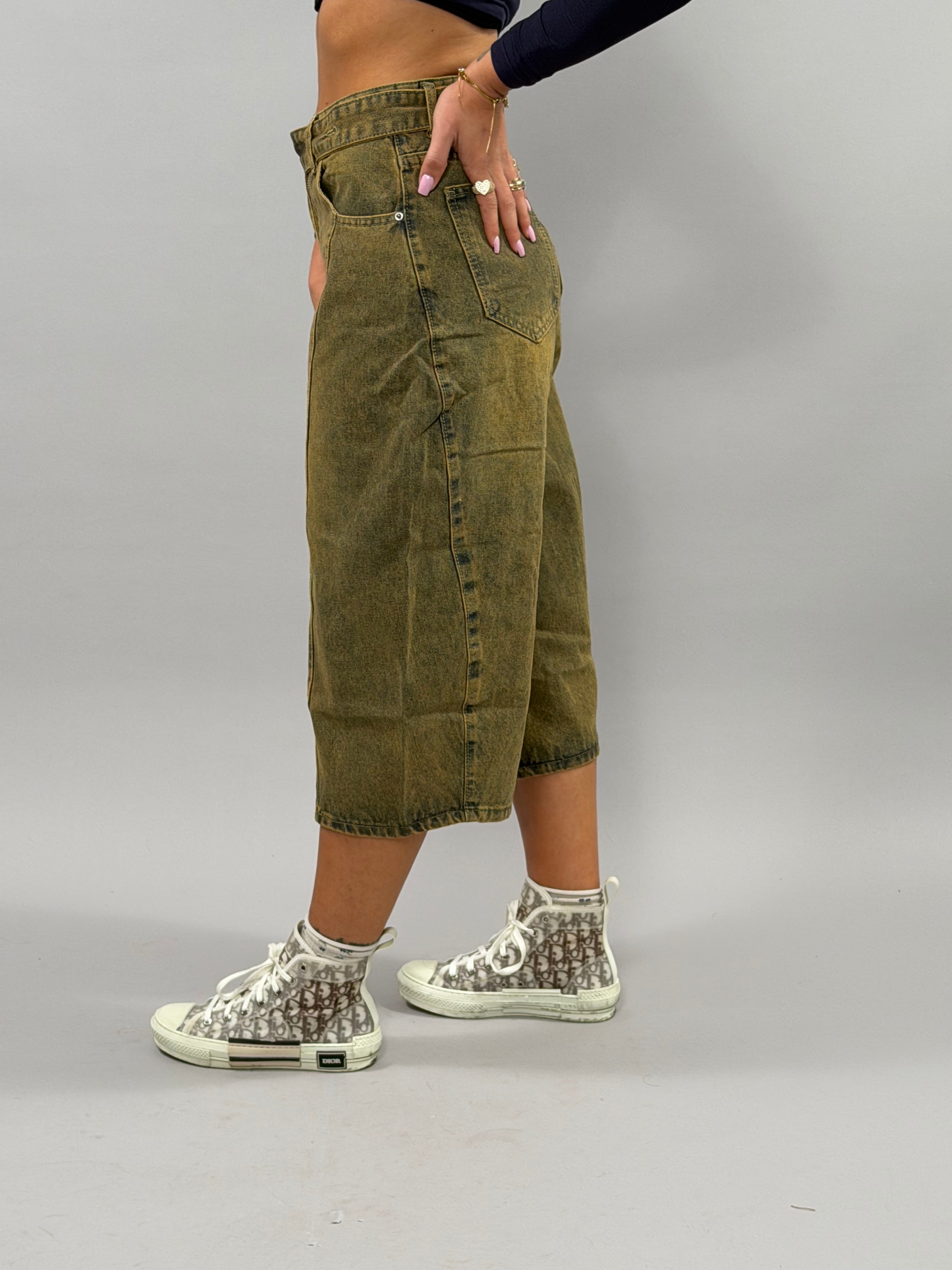 Il Bermuda Arianna è disponibile in un elegante colore marmo e offre una gamma di taglie da S a XXL, garantendo una vestibilità adatta a diverse conformazioni fisiche. La modella, alta 168 cm, indossa una taglia M, evidenziando il design versatile e confortevole di questo capo.