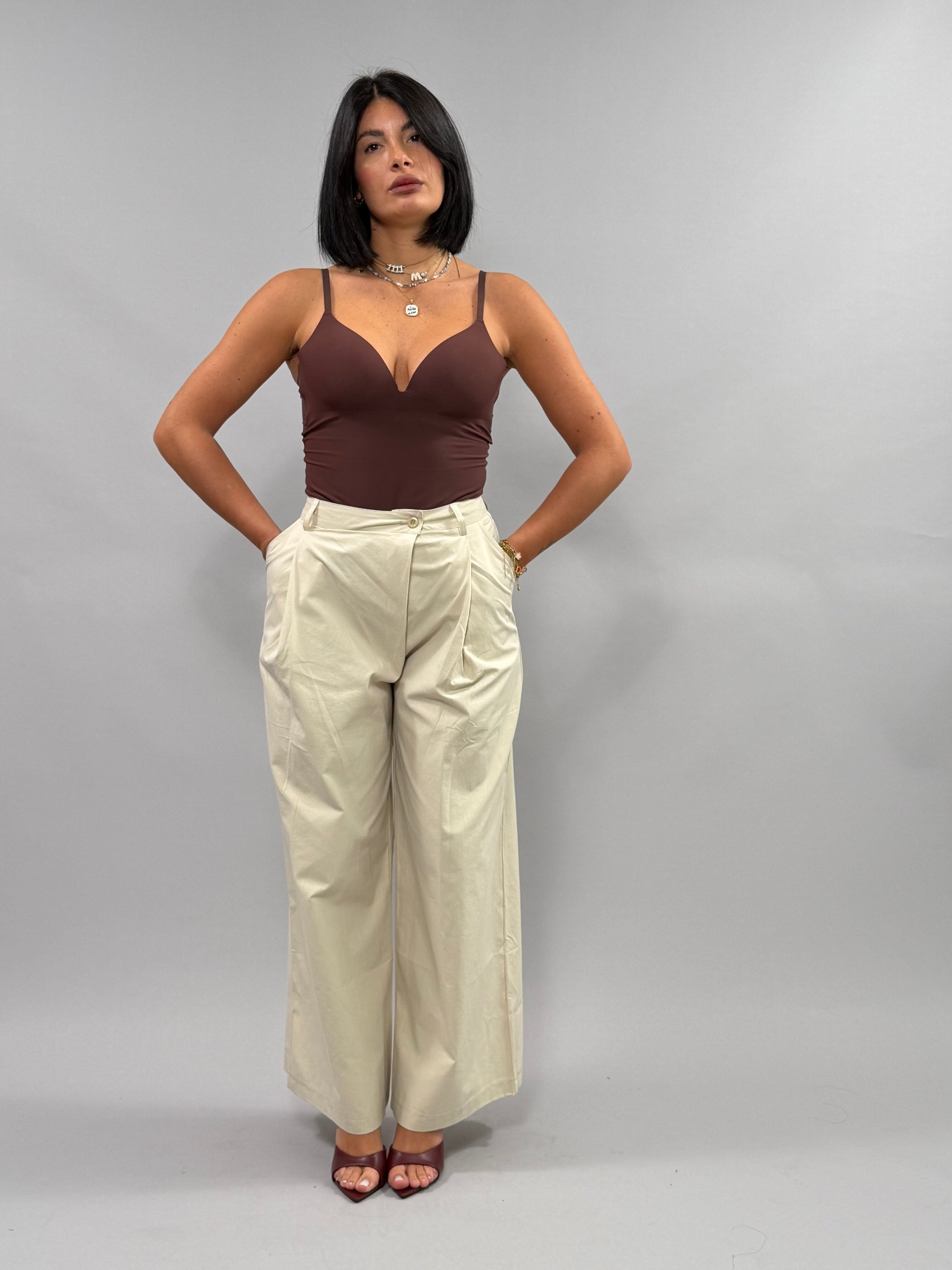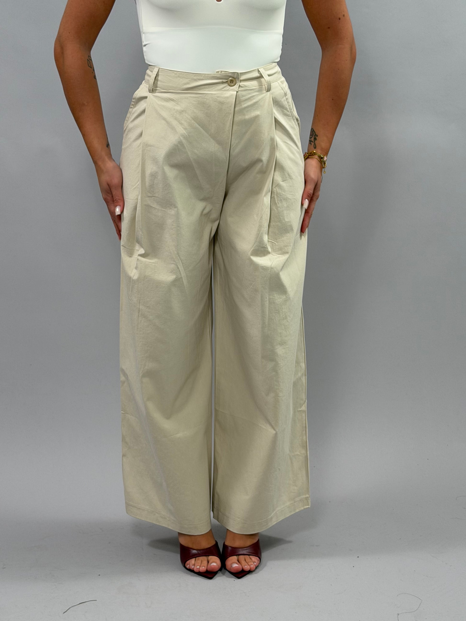 Il Pantalone Antonia è disponibile nelle taglie S, M e L. Realizzato in un elegante colore panna, offre una vestibilità ottimale per diverse silhouette. La modella, alta 168 cm, indossa una taglia S, dimostrando come questo capo possa adattarsi a varie altezze e corporature, garantendo comfort e stile.