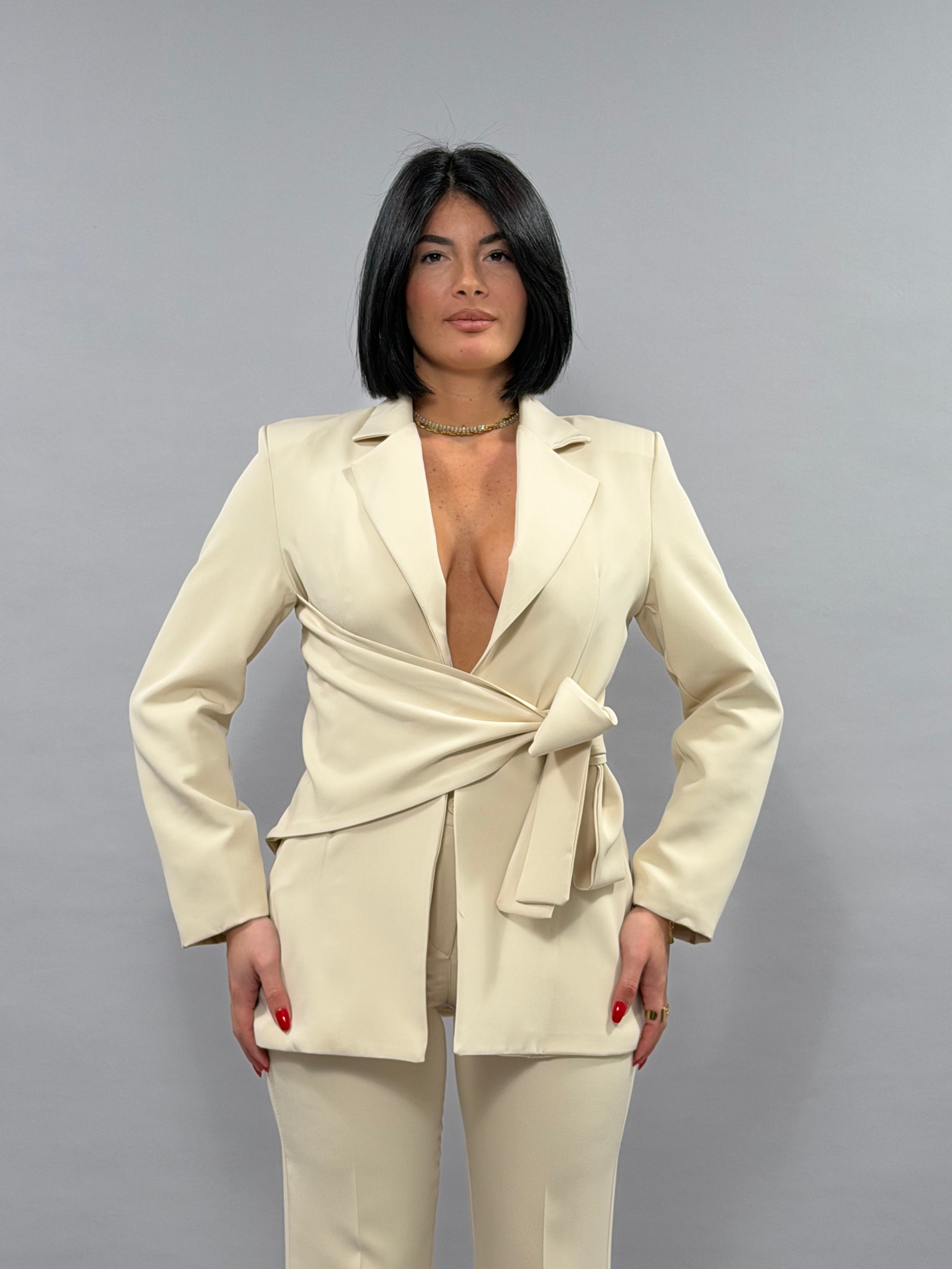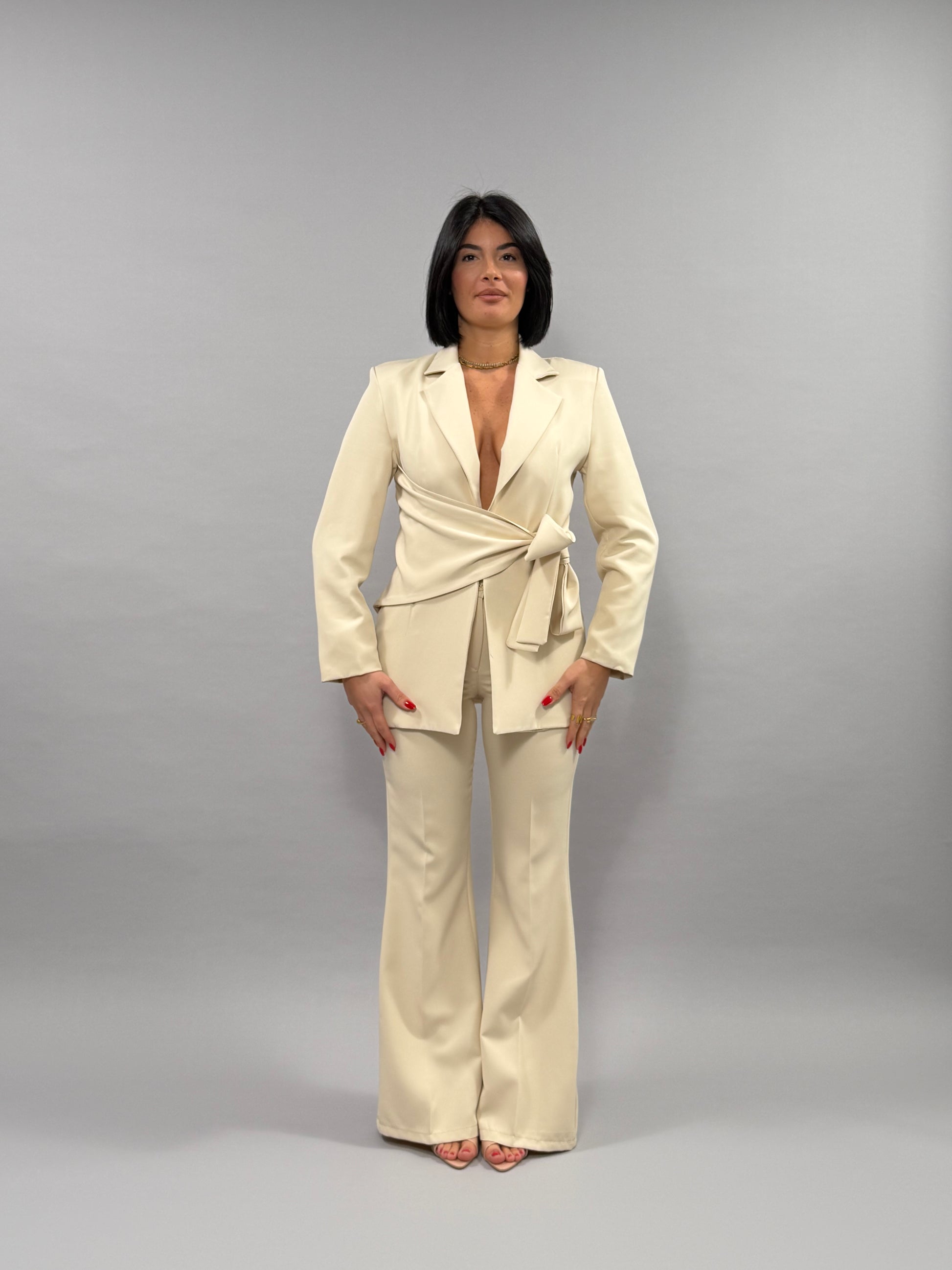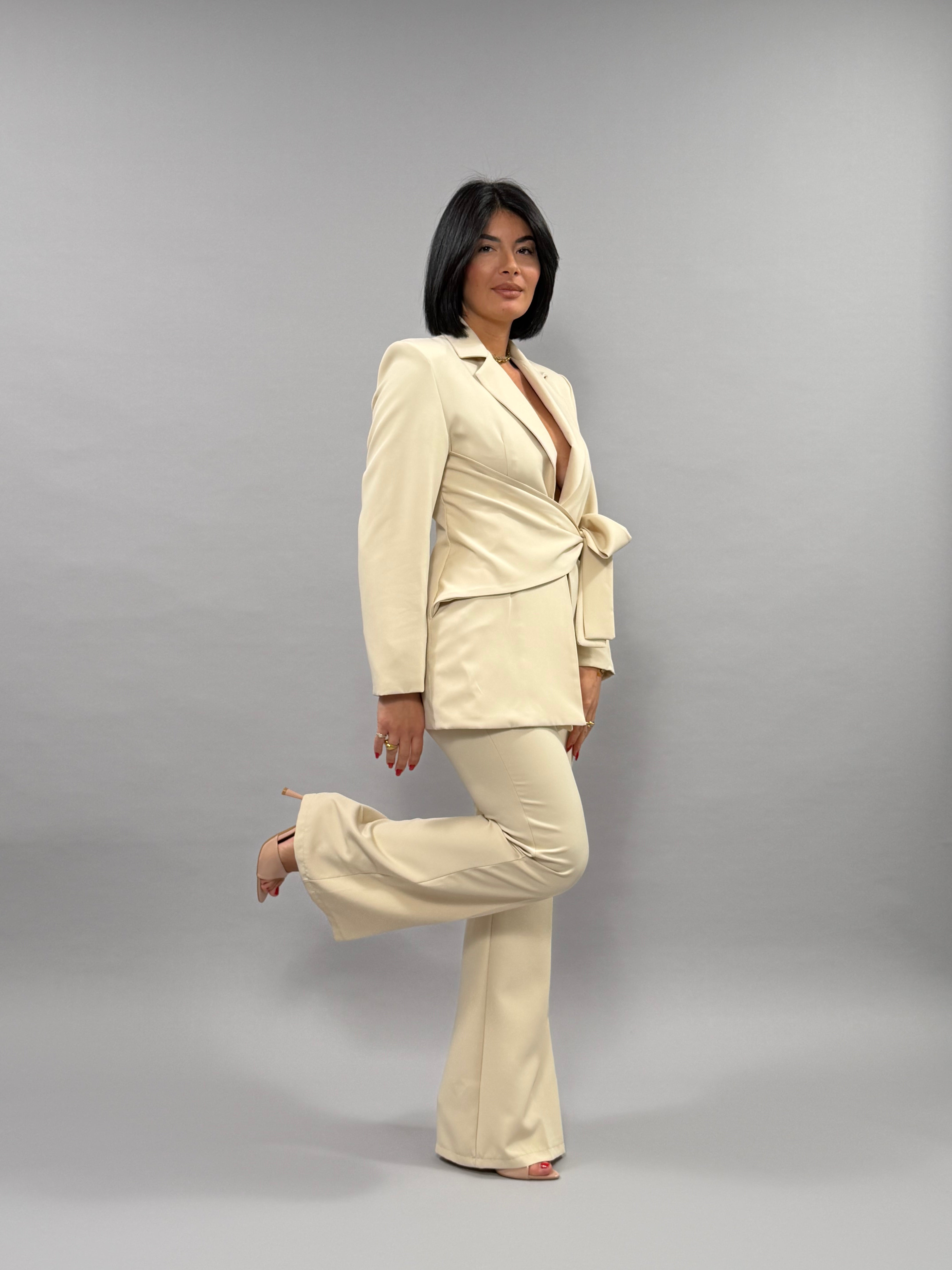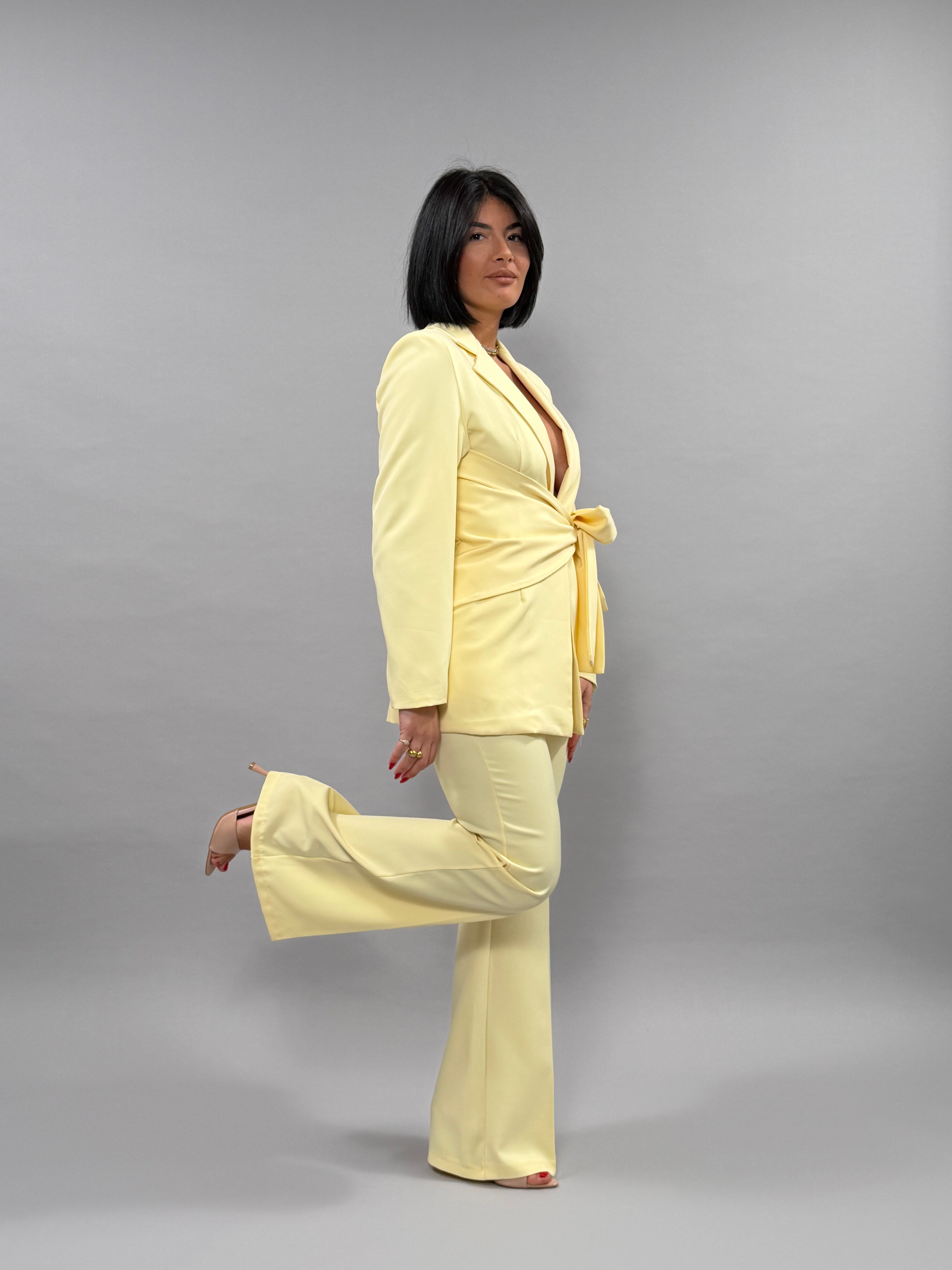 Elegante tailleur con fiocco decorativo, perfetto per occasioni speciali e look sofisticati. Disponibile in quattro colori versatili: giallo, nero, beige e bordeaux. Tagliato in taglia unica che veste fino alla 44, garantisce una silhouette impeccabile e femminile. La modella in foto, alta 168 cm, mostra come il capo valorizza la figura con eleganza. Un pezzo versatile da indossare per cene, eventi e momenti che richiedono stile e raffinatezza.