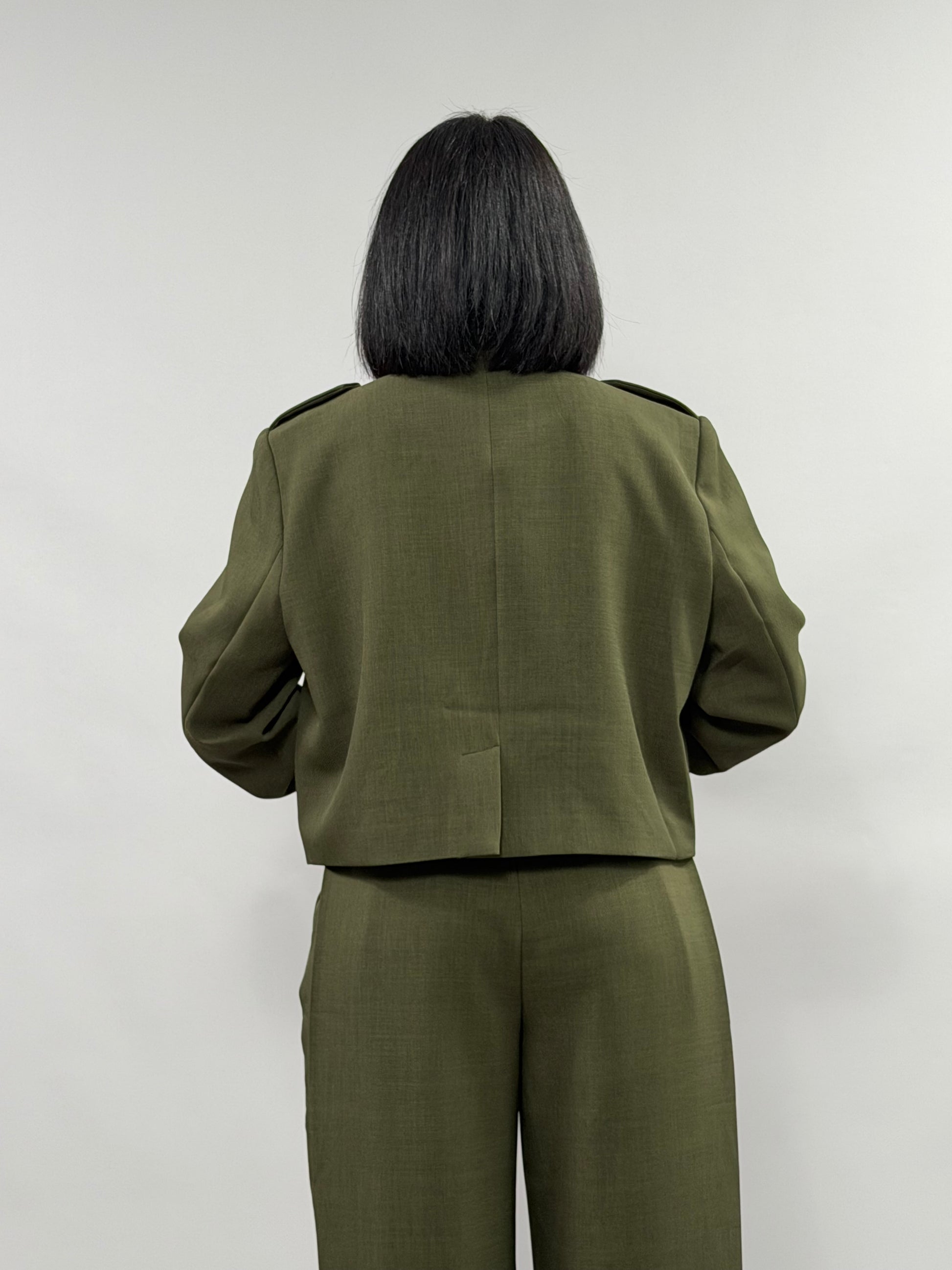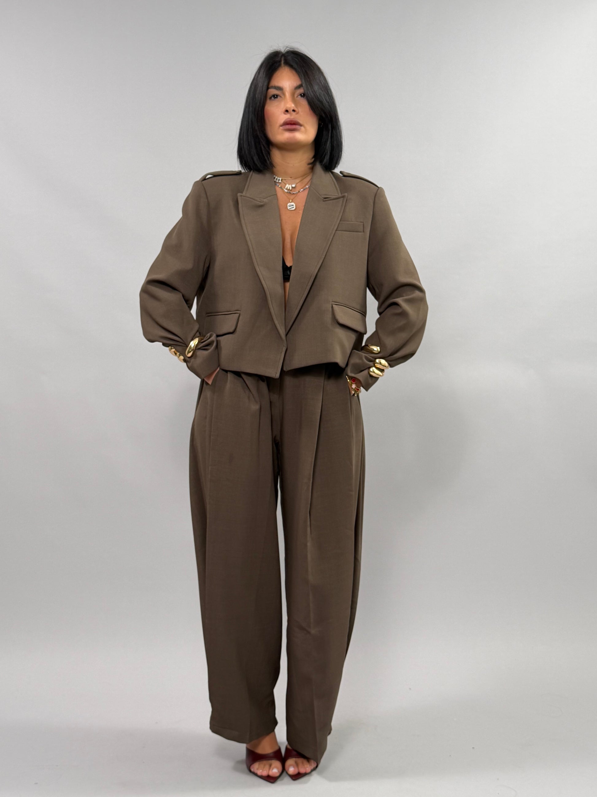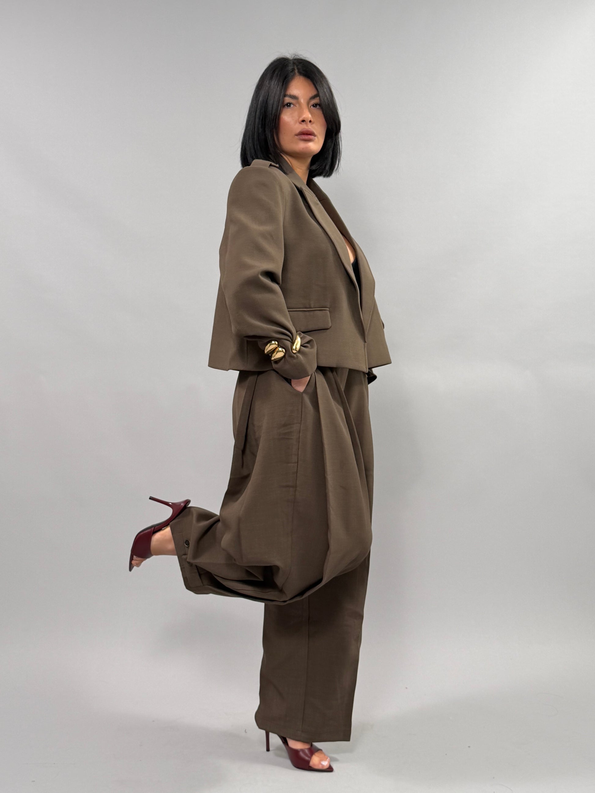 Il Tailleur Serafina è disponibile nelle taglie S, M e L, nelle tonalità verde e marrone. La modella indossa una taglia S ed è alta 168 cm, dimostrando come il design si adatti a diverse morfologie. Questo tailleur offre uno stile elegante e versatile, ideale per molteplici occasioni.