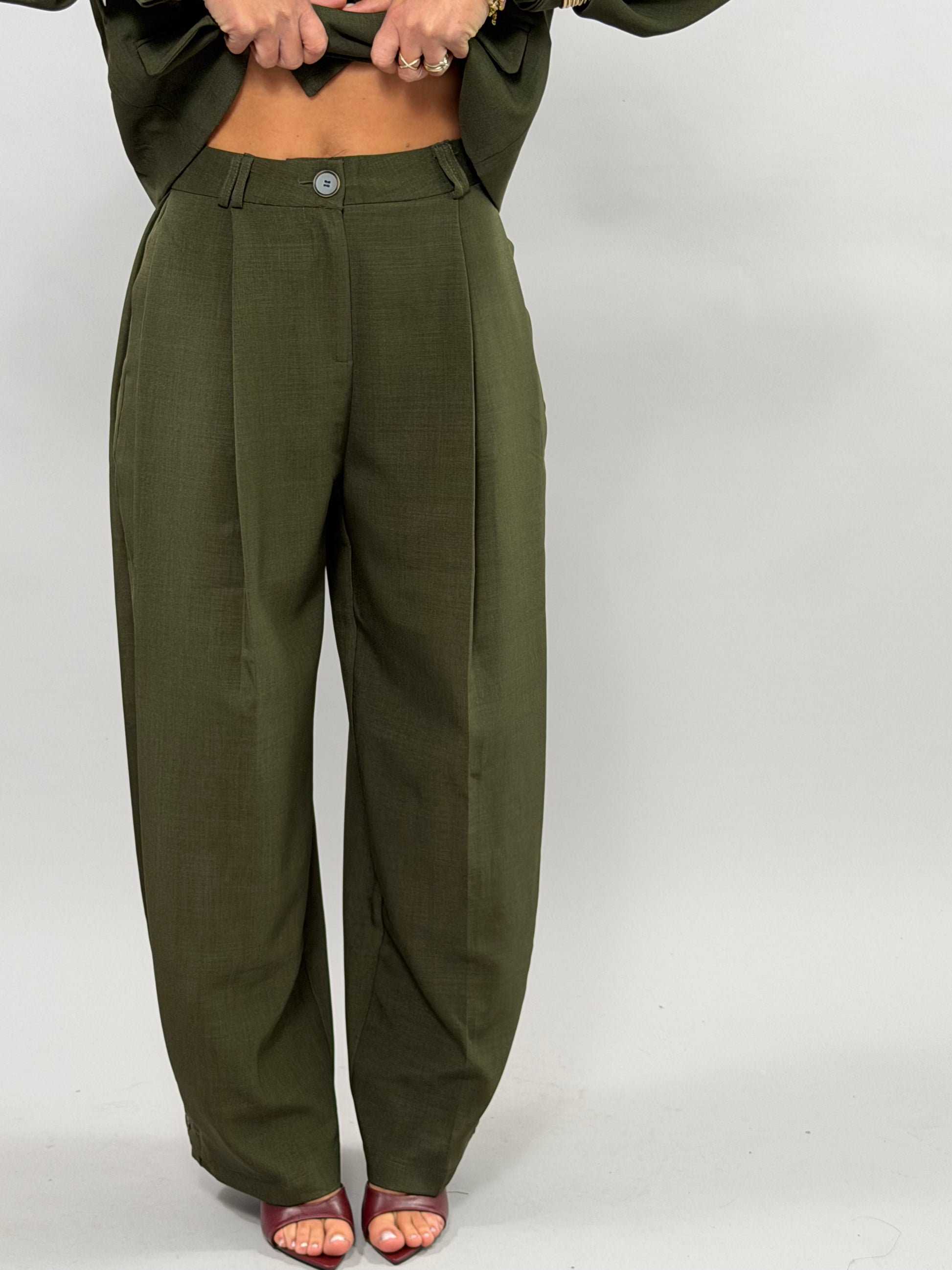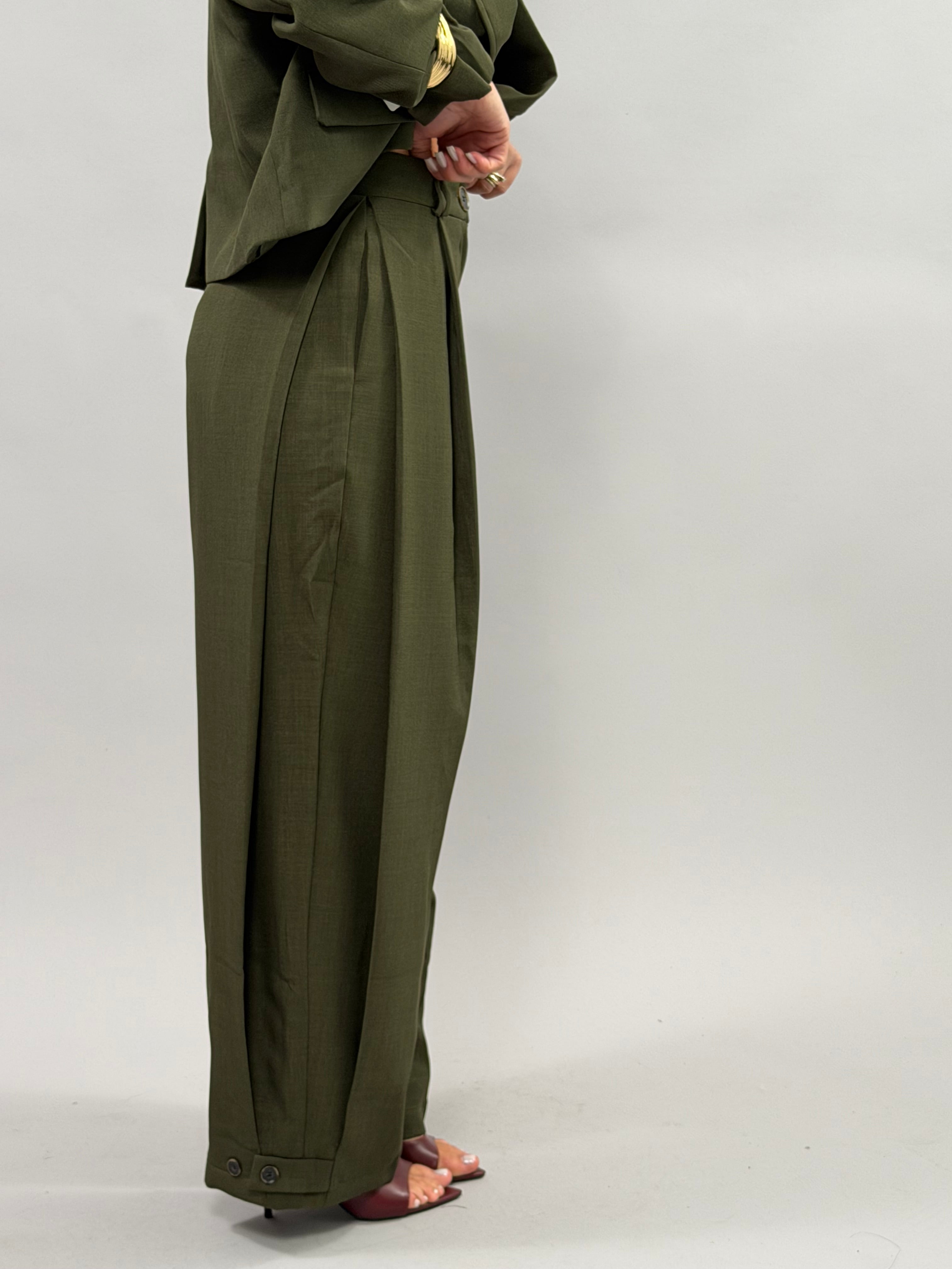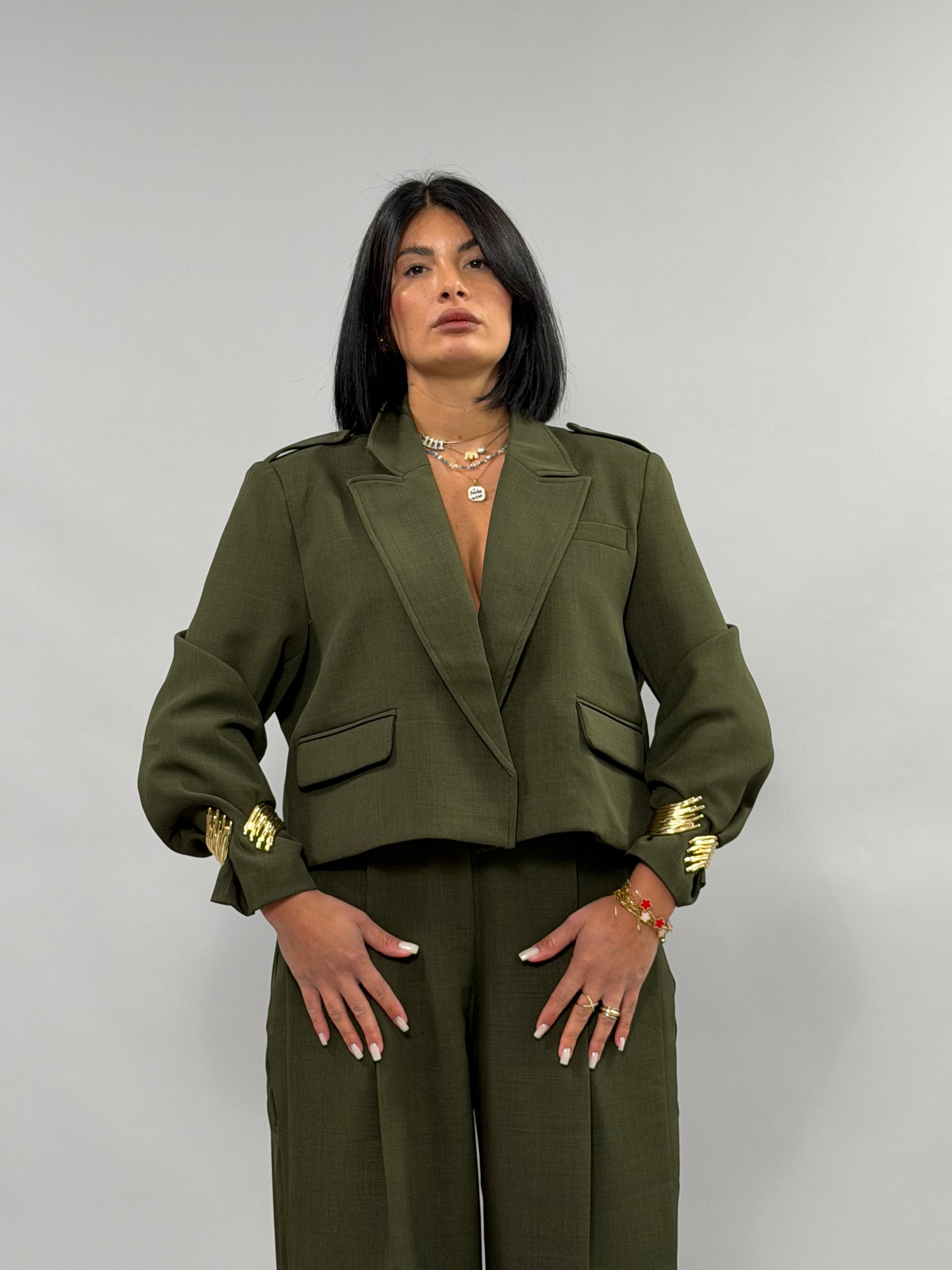 Il Tailleur Serafina è disponibile nelle taglie S, M e L, nelle tonalità verde e marrone. La modella indossa una taglia S ed è alta 168 cm, dimostrando come il design si adatti a diverse morfologie. Questo tailleur offre uno stile elegante e versatile, ideale per molteplici occasioni.