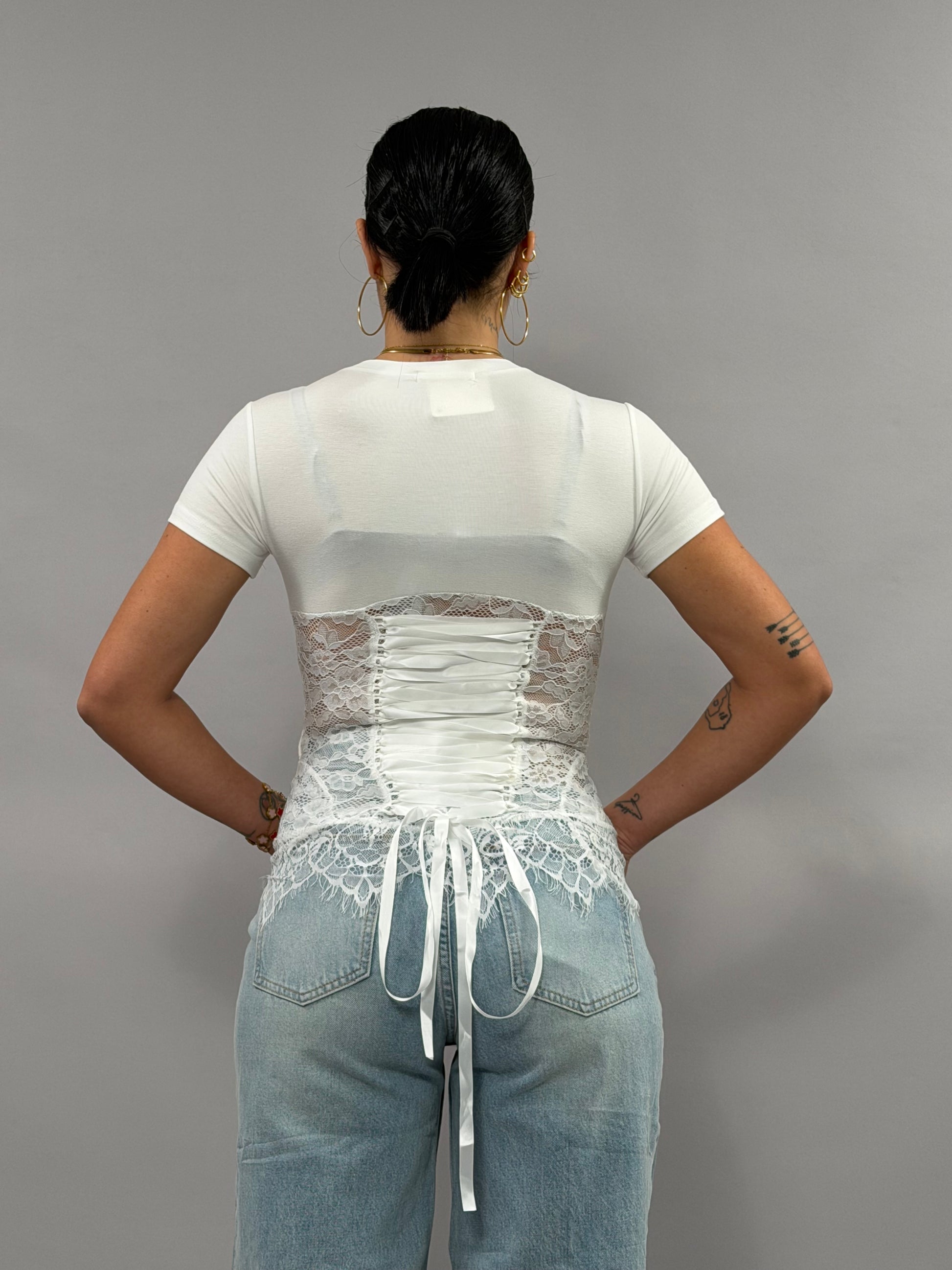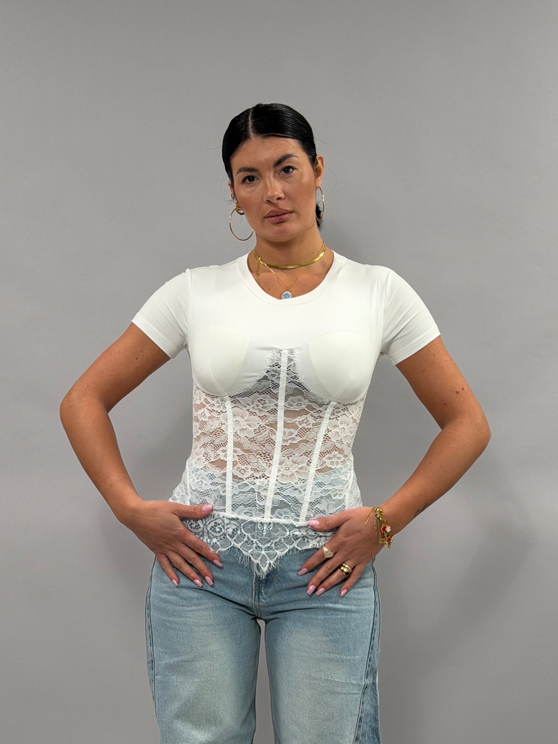 La T-Shirt Rodi, realizzata in merletto bianco e taglia unica, offre una vestibilità versatile per diverse silhouette. Con un'altezza della modella di 168 cm, il design si adatta a varie corporature, garantendo comfort e stile in ogni occasione.