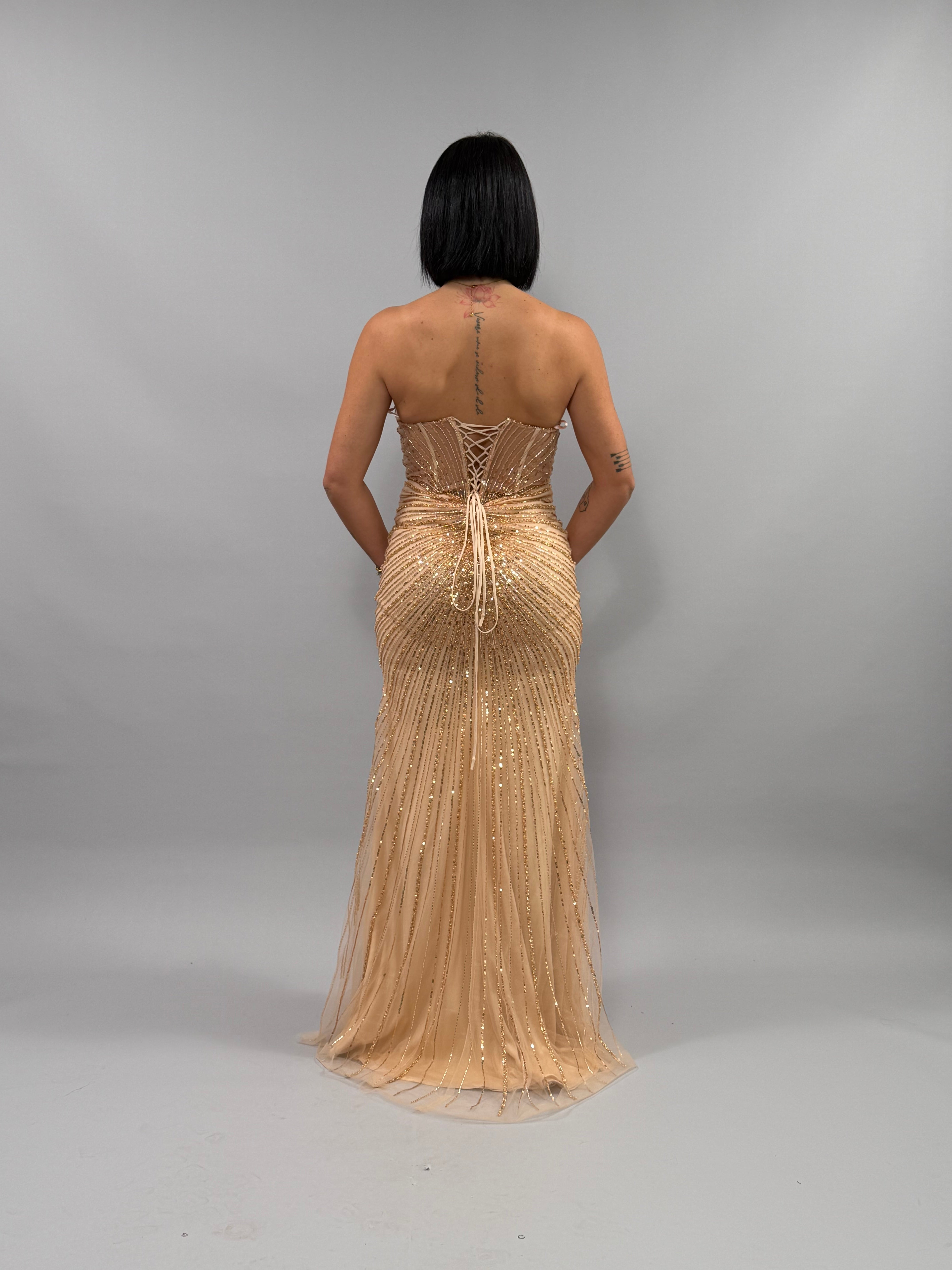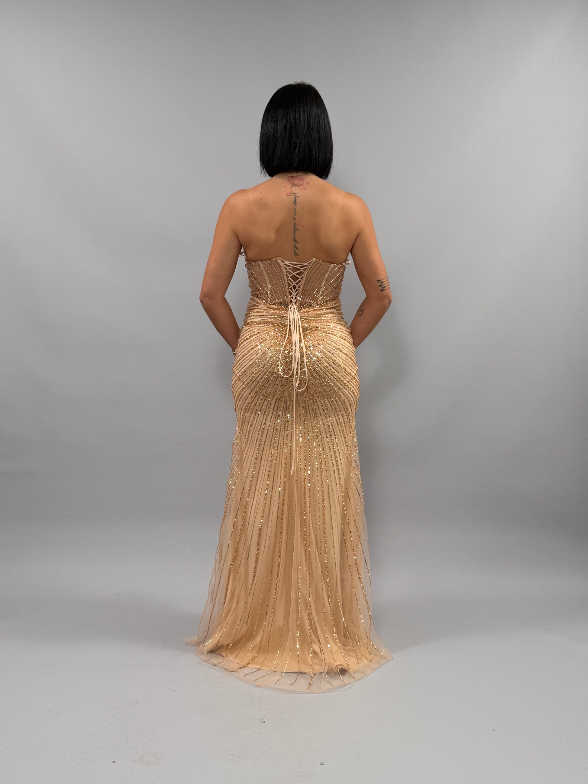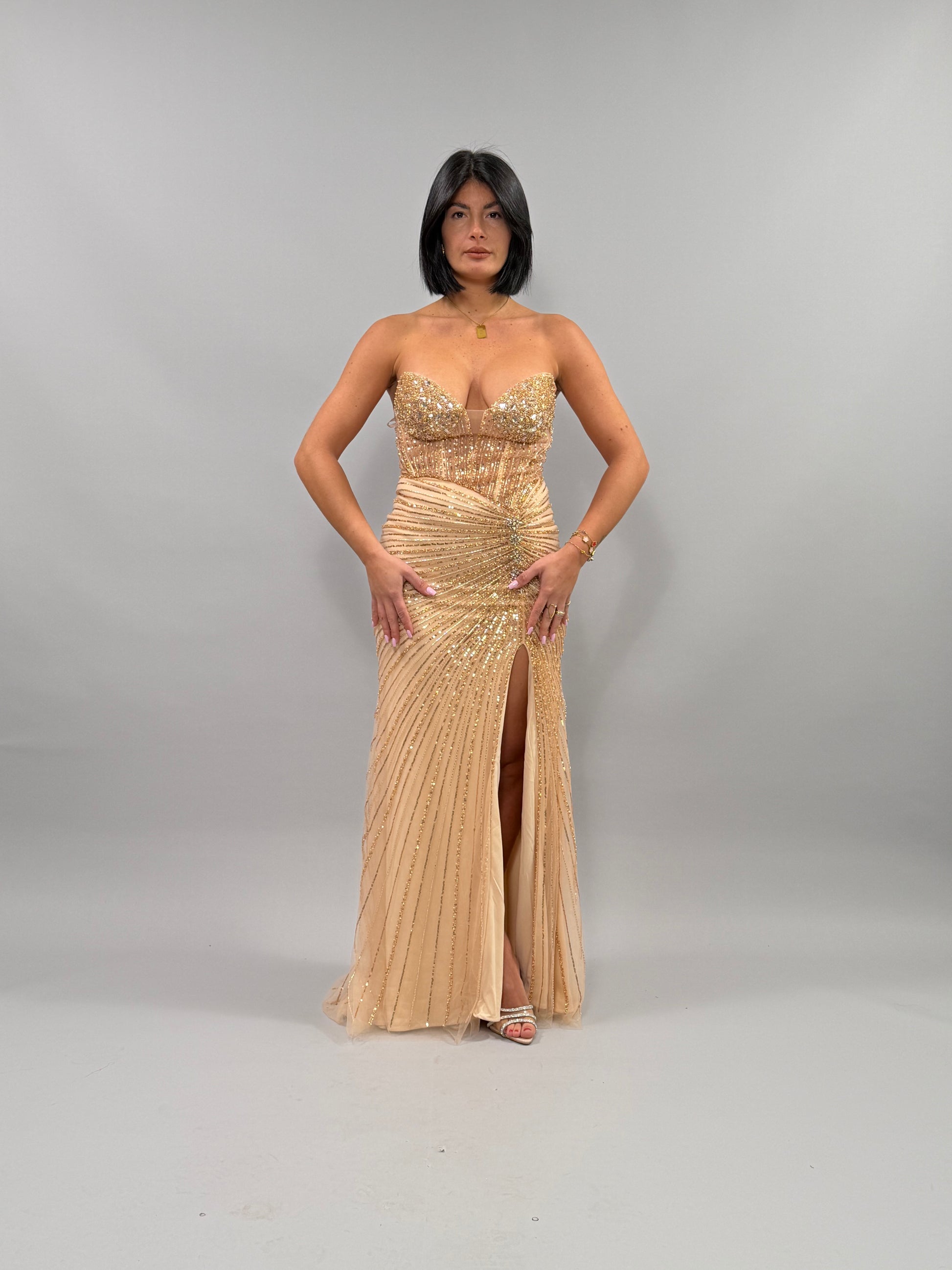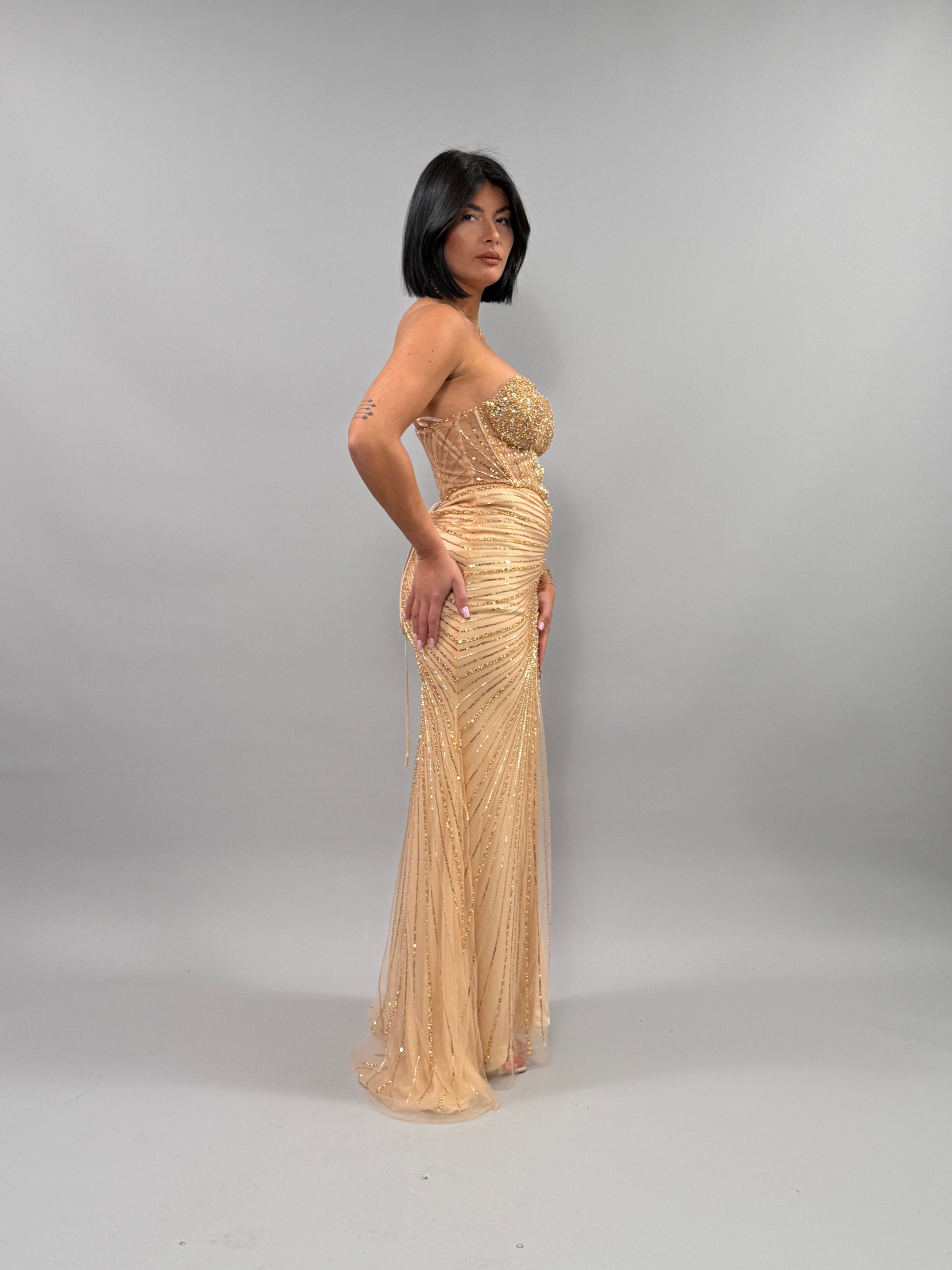 L'Abito Chanel è disponibile in tre misure: S, M e L. La modella, alta 168 cm, indossa una taglia M, evidenziando la vestibilità versatile di questo capo. Il colore oro conferisce un tocco di eleganza, rendendolo adatto per eventi formali e occasioni speciali.