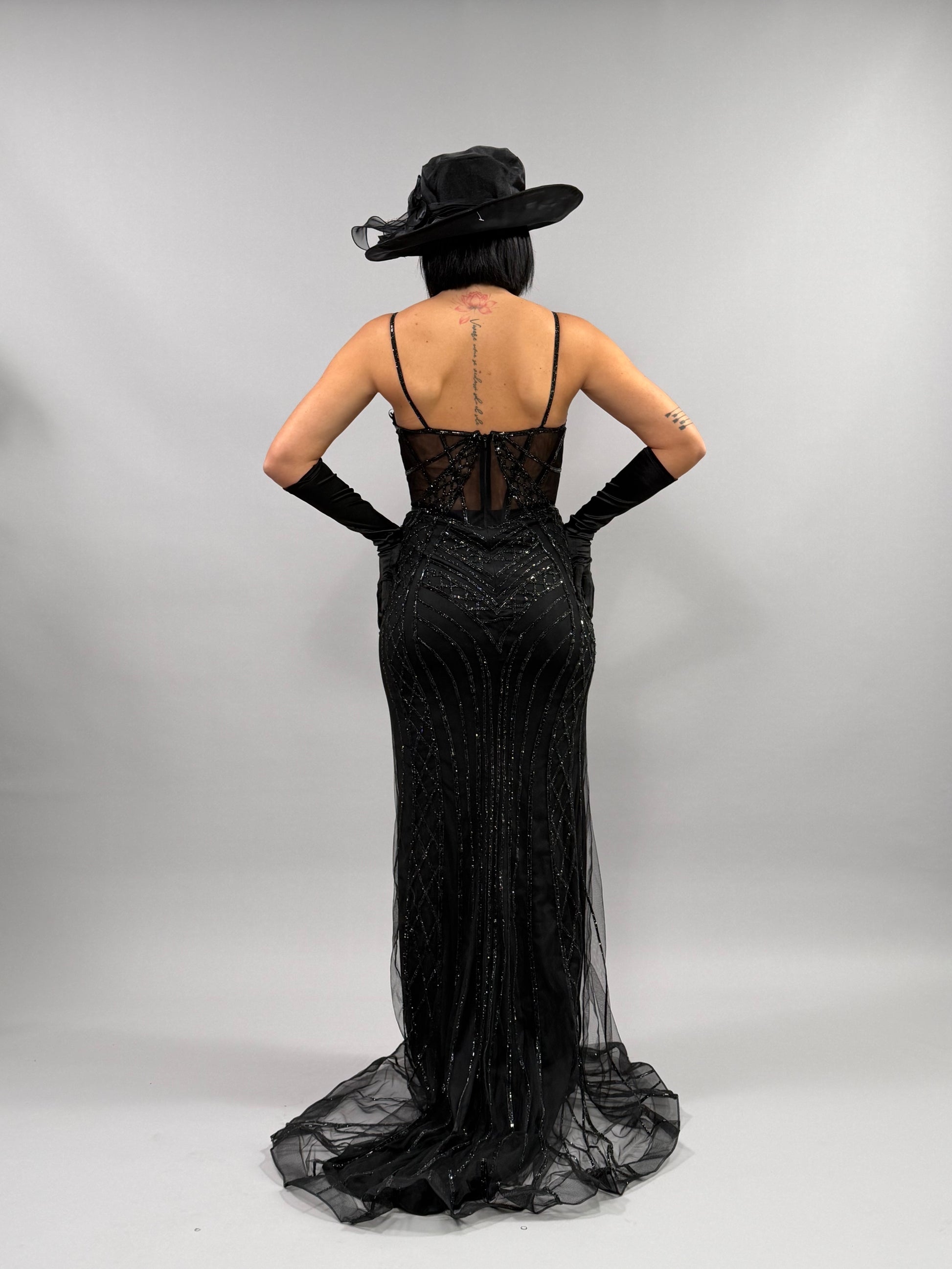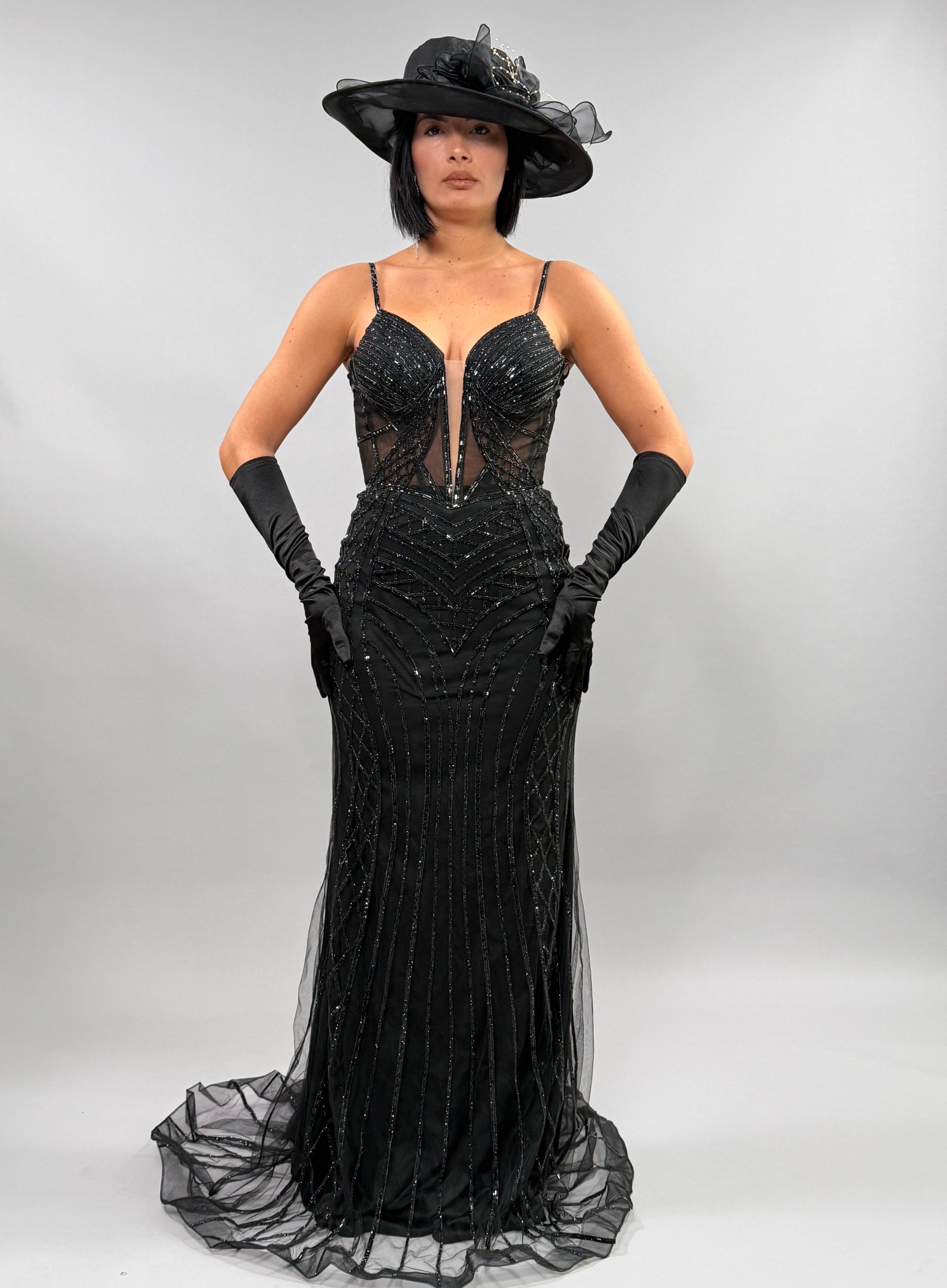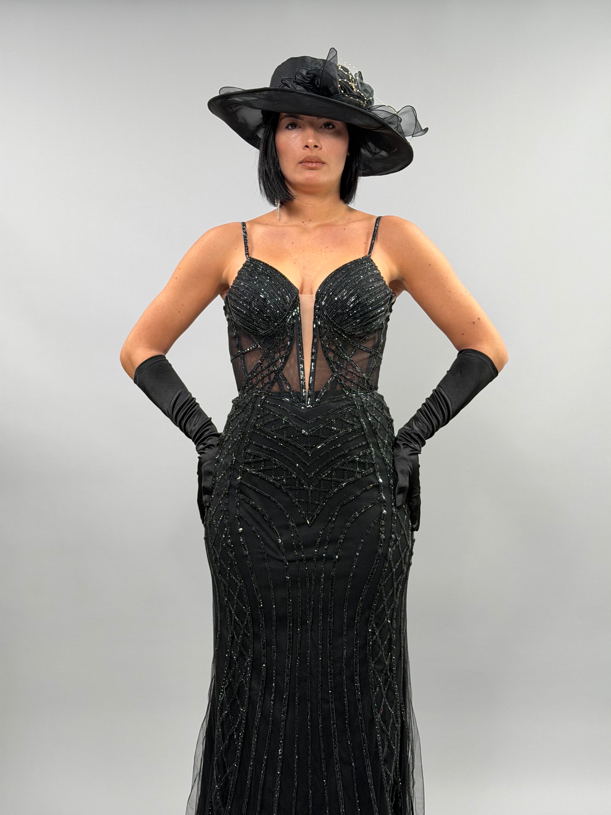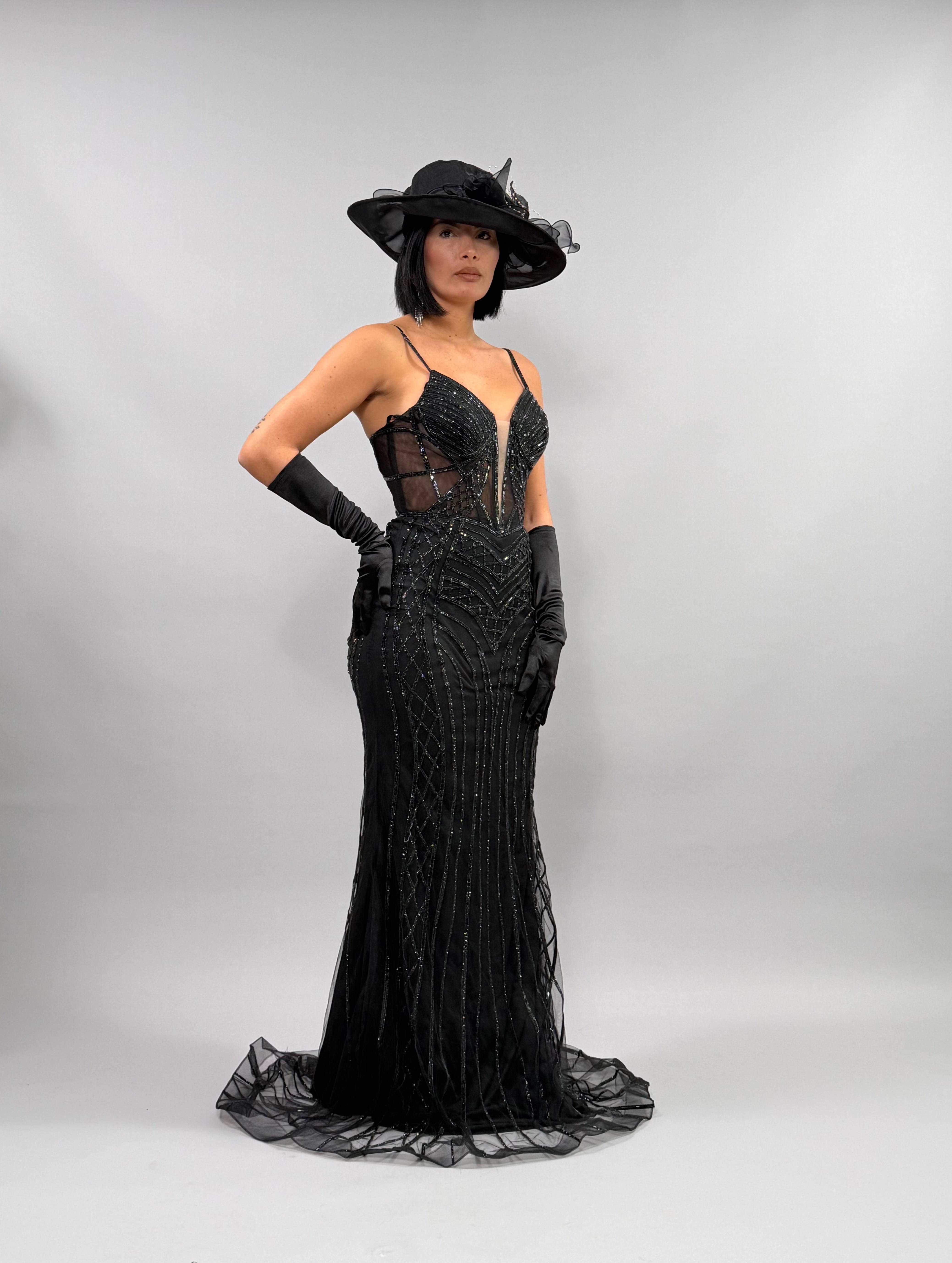 L'Abito Chery è disponibile nelle taglie S, M e L, con la modella che indossa una M e ha un'altezza di 168 cm. Questo abito è accompagnato da un cappello e guanti, offrendo un completo elegante. La coordinazione di questi elementi consente di creare un look raffinato e per occasioni importanti.