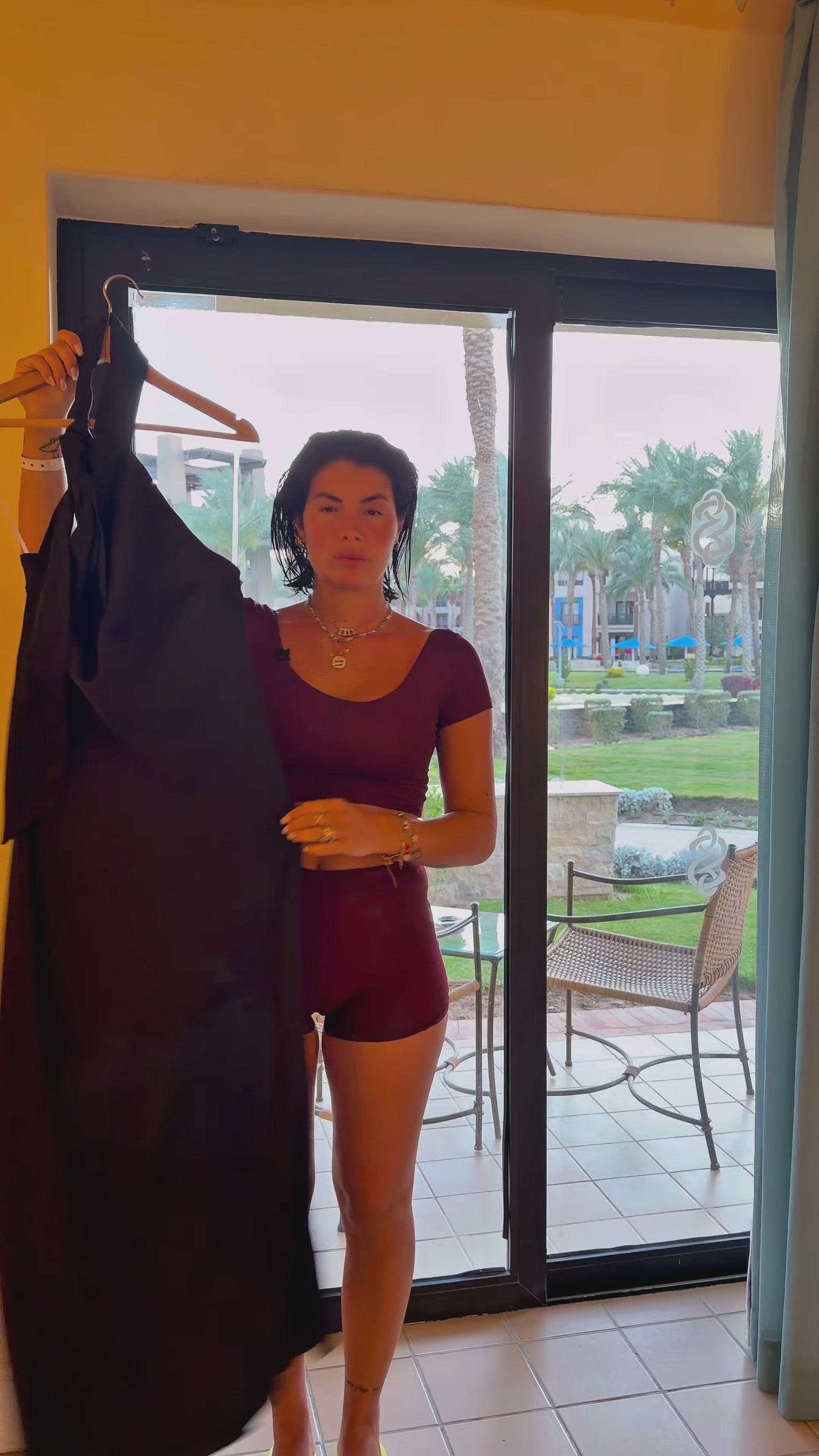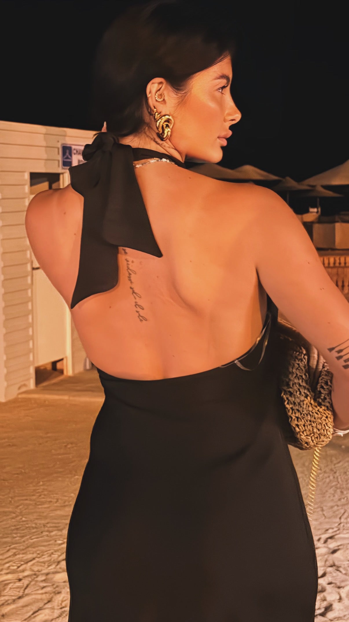 L'Abito Egitto è realizzato al 100% in cotone, garantendo comfort e traspirabilità. Disponibile in una sola variante nera e in taglia unica, si adatta a diverse silhouette. La modella, alta 168 cm, dimostra la versatilità dell'abito, ideale per varie occasioni e facilmente abbinabile.