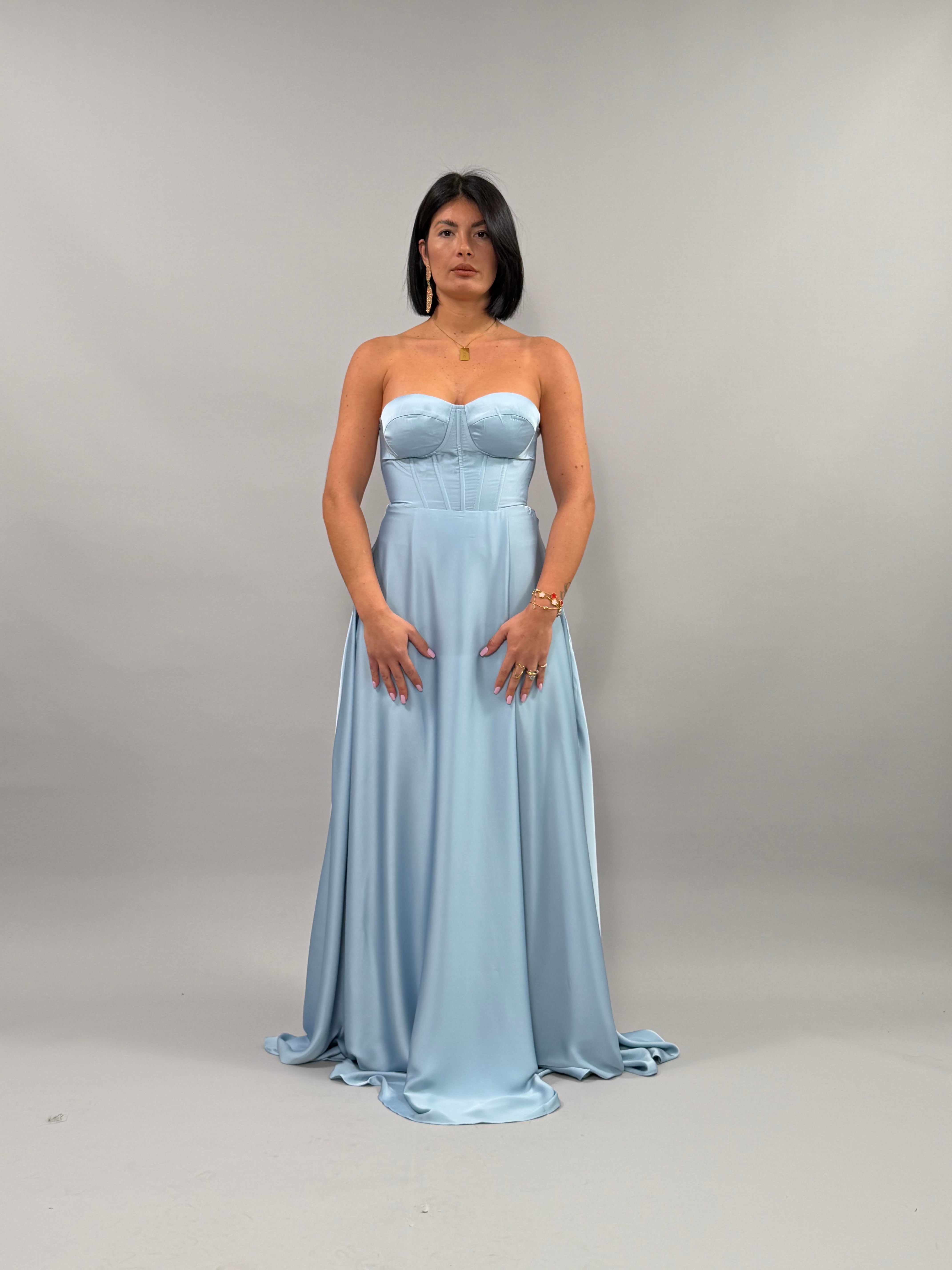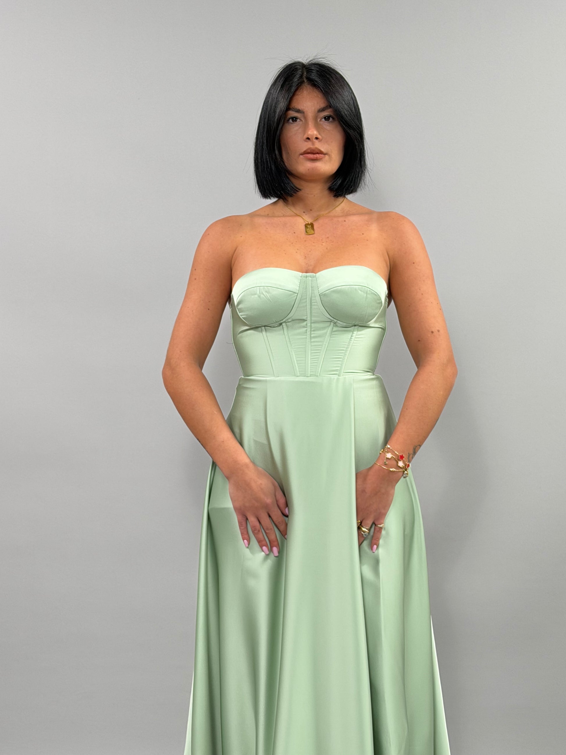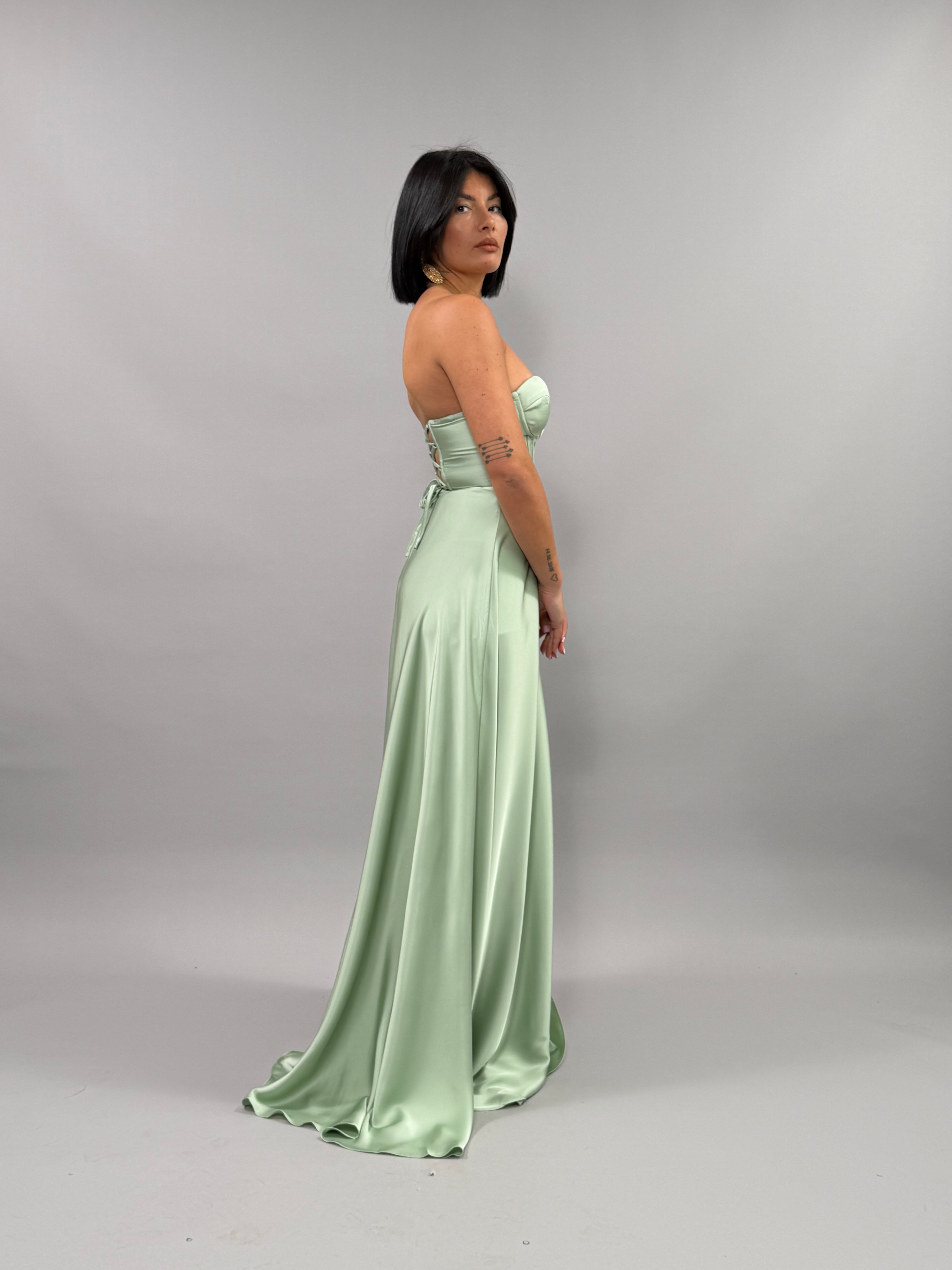 L'Abito Venere è disponibile in due eleganti varianti di colore: verde salvia e azzurro. Offre un'ampia gamma di taglie (S, M, L) per una vestibilità ottimale, con la modella che indossa una taglia M e un'altezza di 168 cm. Ideale per ogni occasione, combina eleganza e stile.
