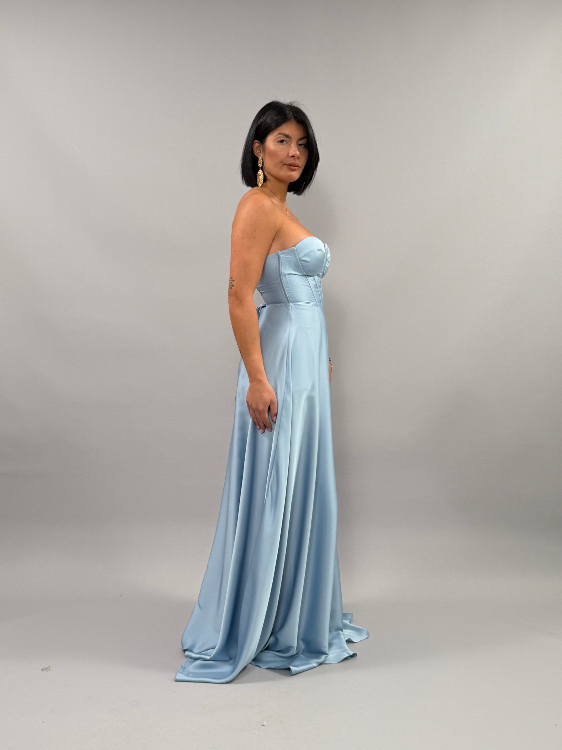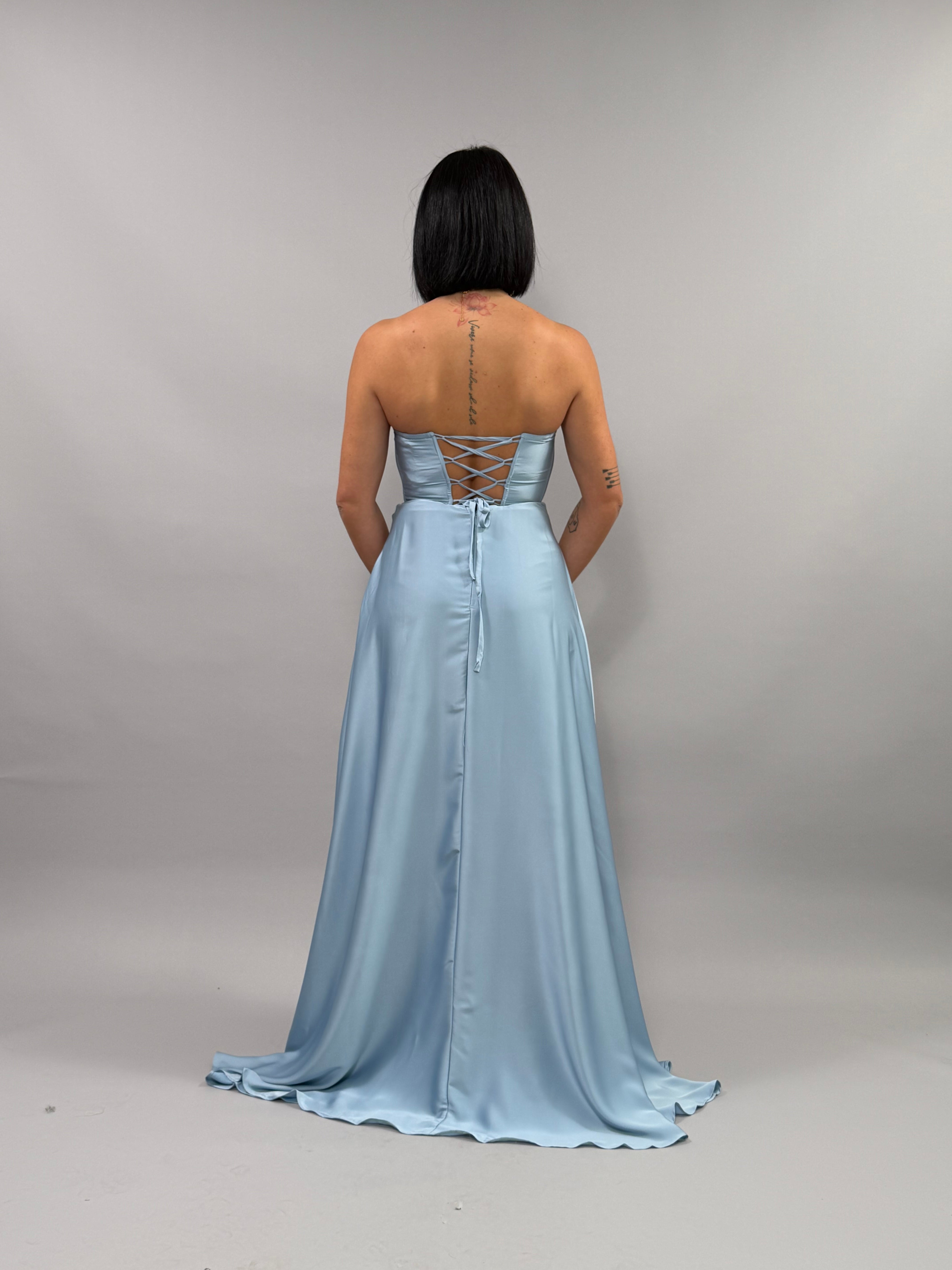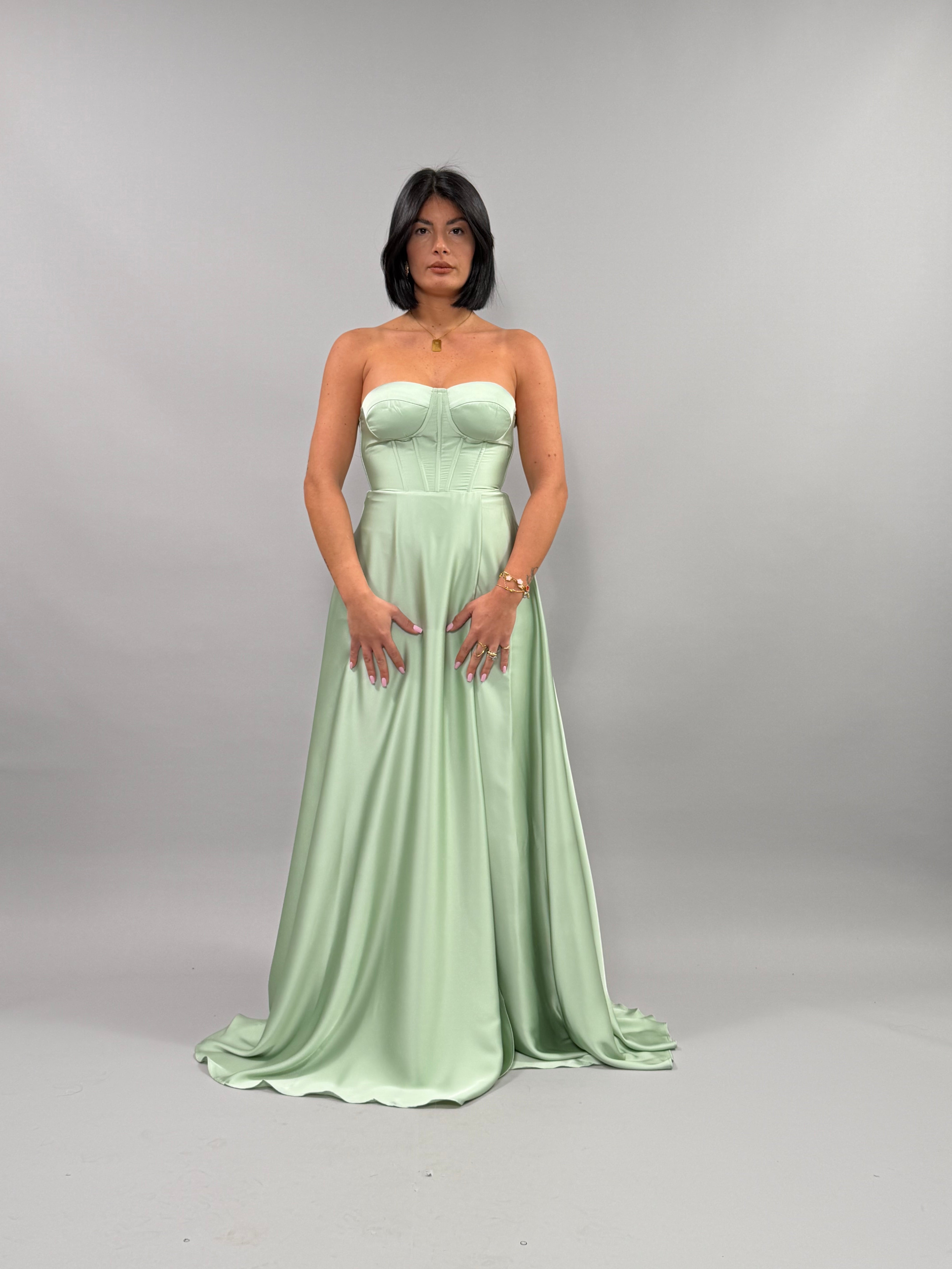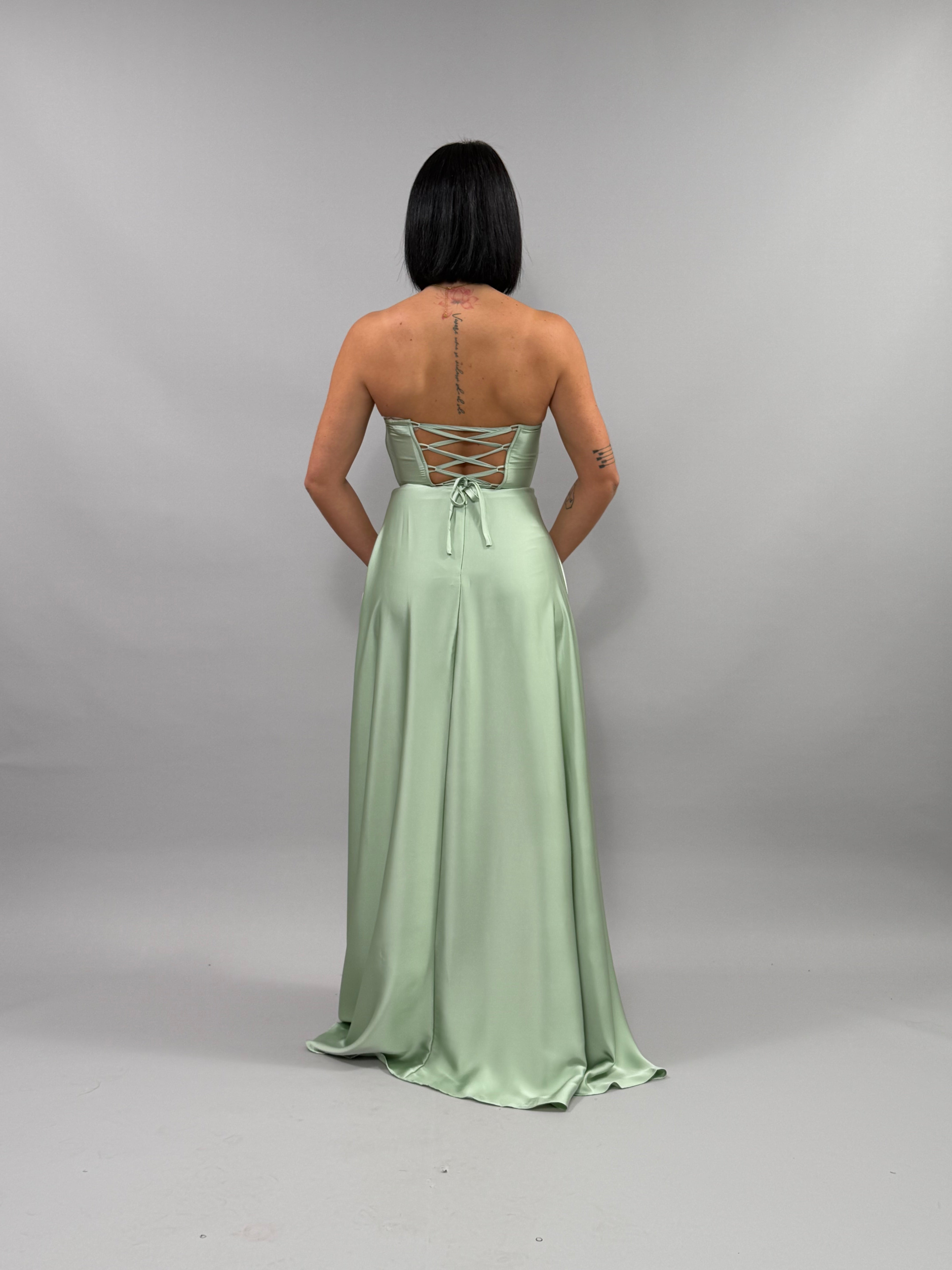L'Abito Venere è disponibile in due eleganti varianti di colore: verde salvia e azzurro. Offre un'ampia gamma di taglie (S, M, L) per una vestibilità ottimale, con la modella che indossa una taglia M e un'altezza di 168 cm. Ideale per ogni occasione, combina eleganza e stile.