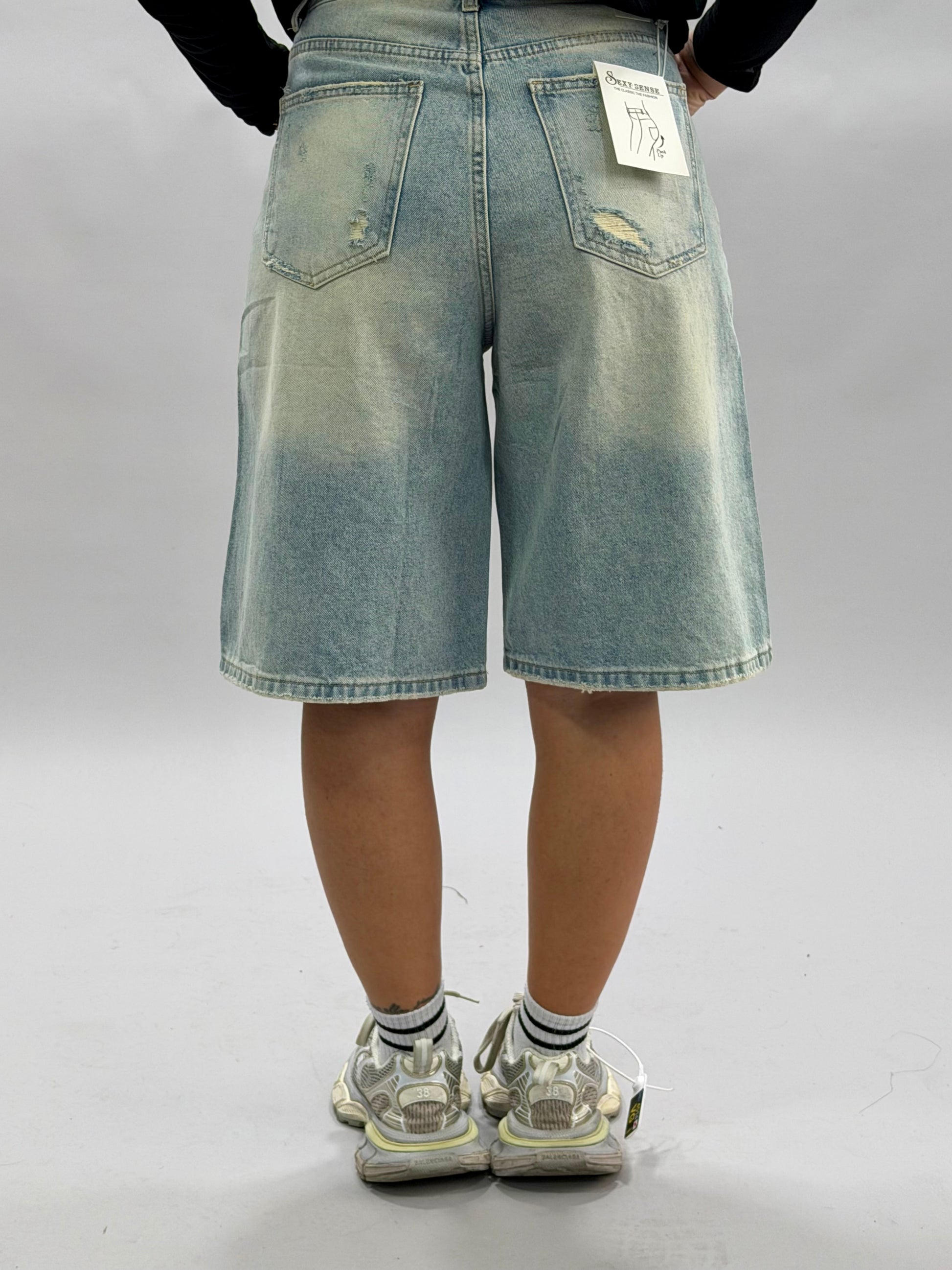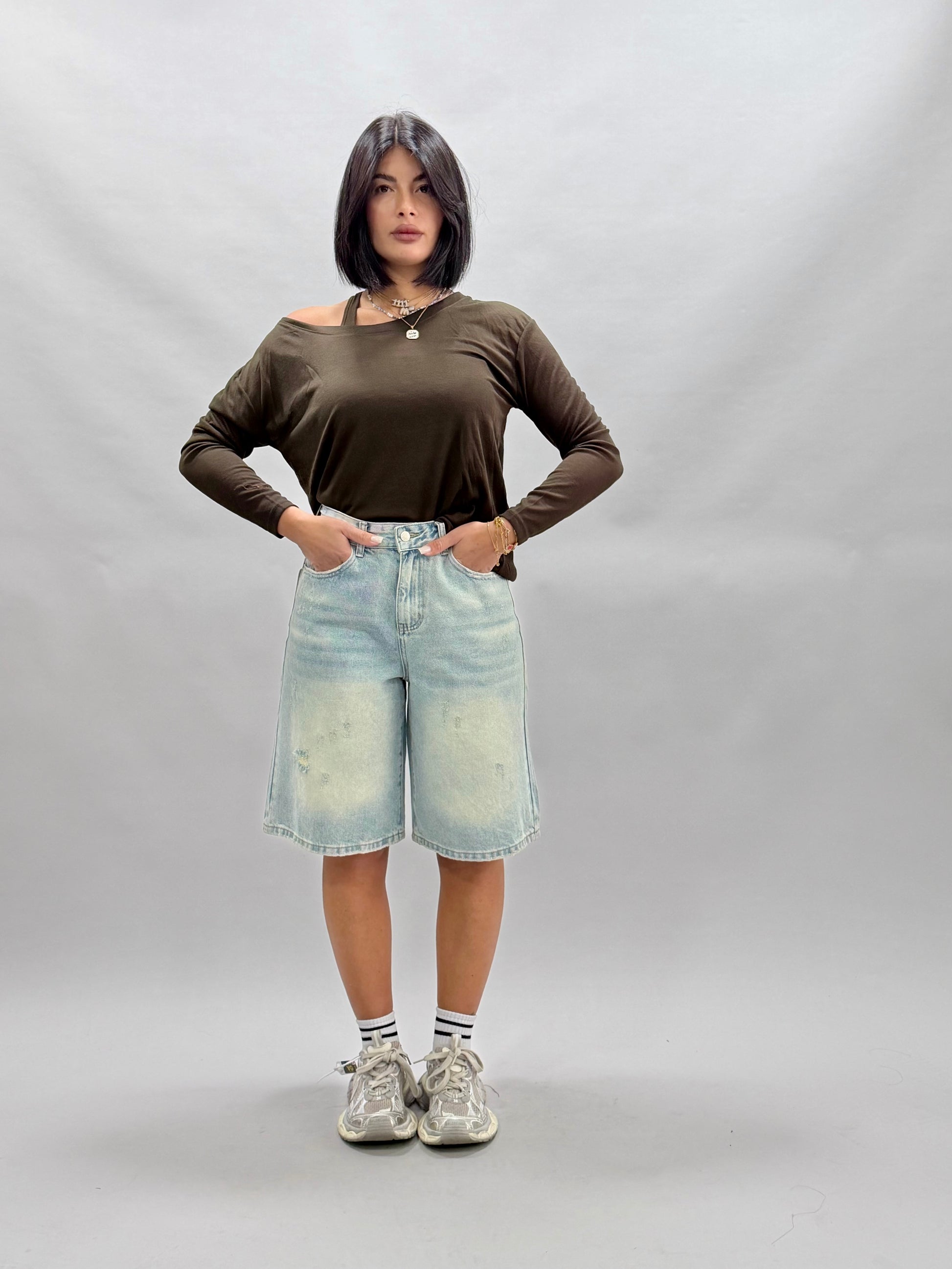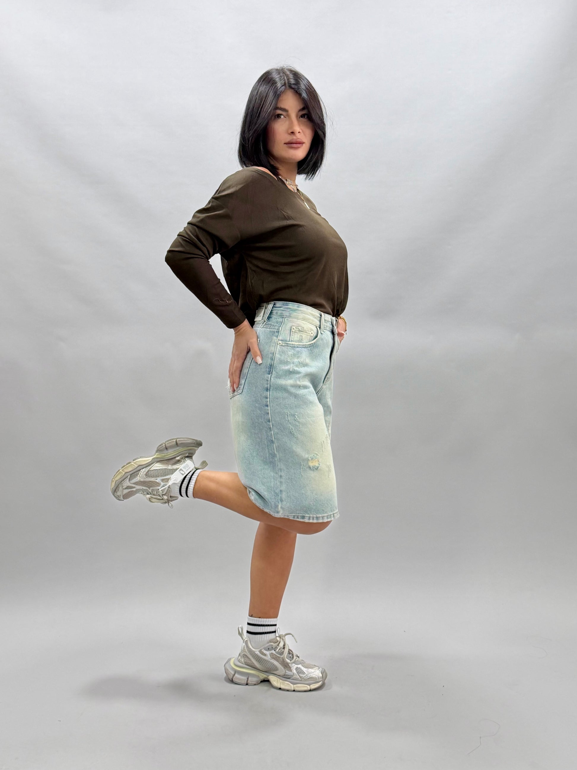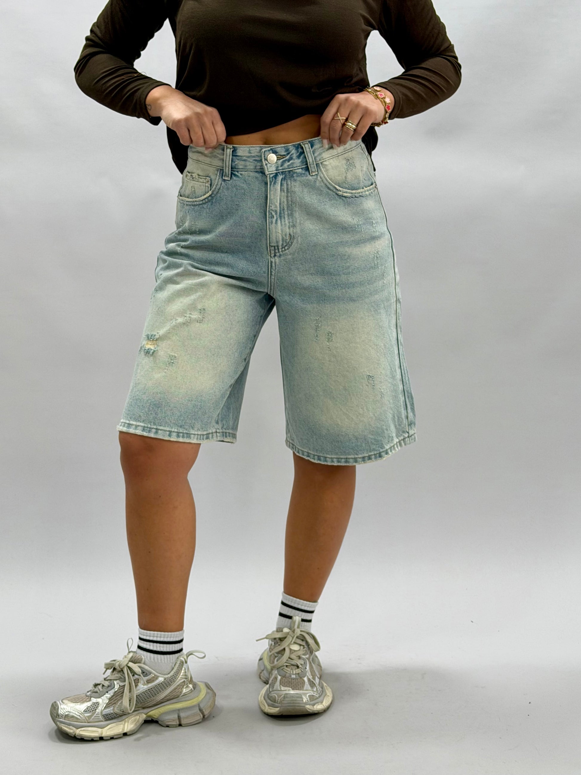 I bermuda Silvia, disponibili in colore denim e nelle taglie dalla XS alla XL, offrono una vestibilità versatile e comoda. La modella indossa una taglia S e misura 168 cm, evidenziando il design adattabile e alla moda di questo prodotto, ideale per diverse corporature.
