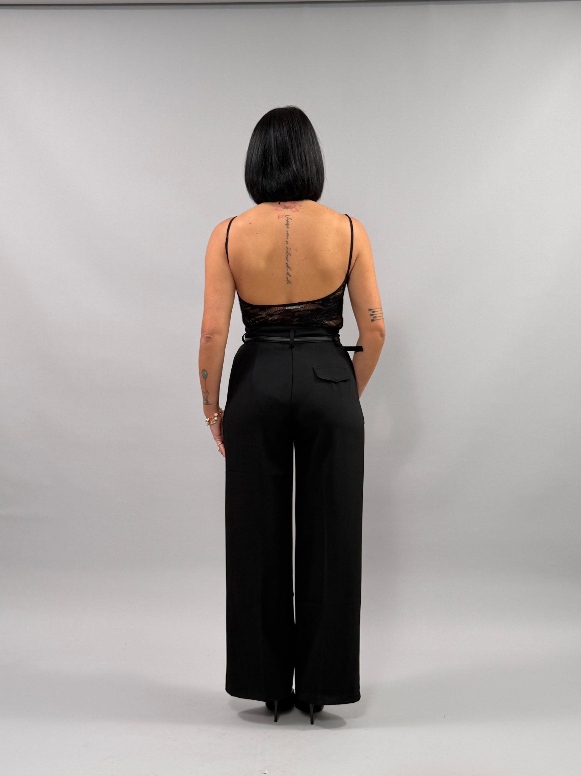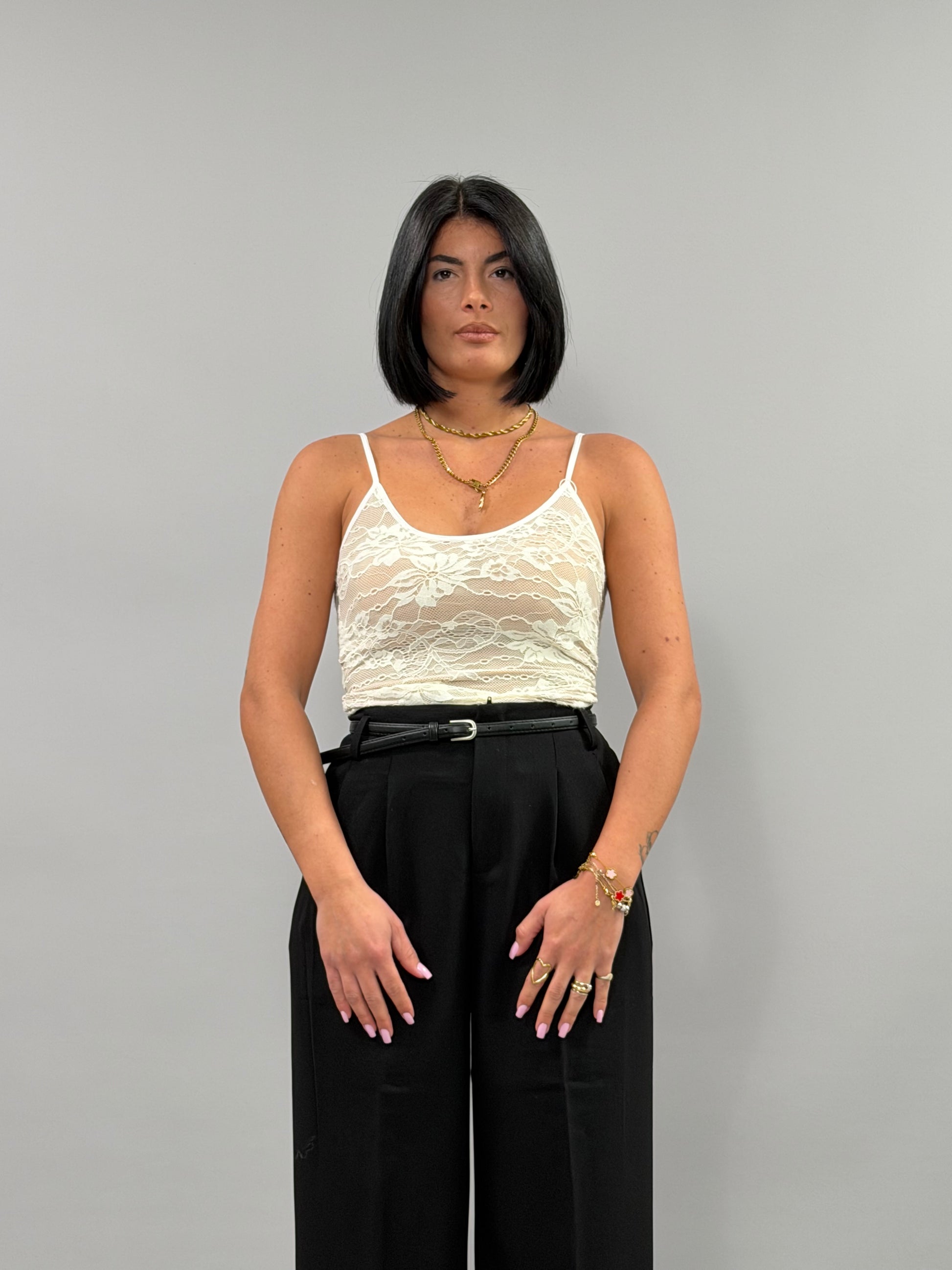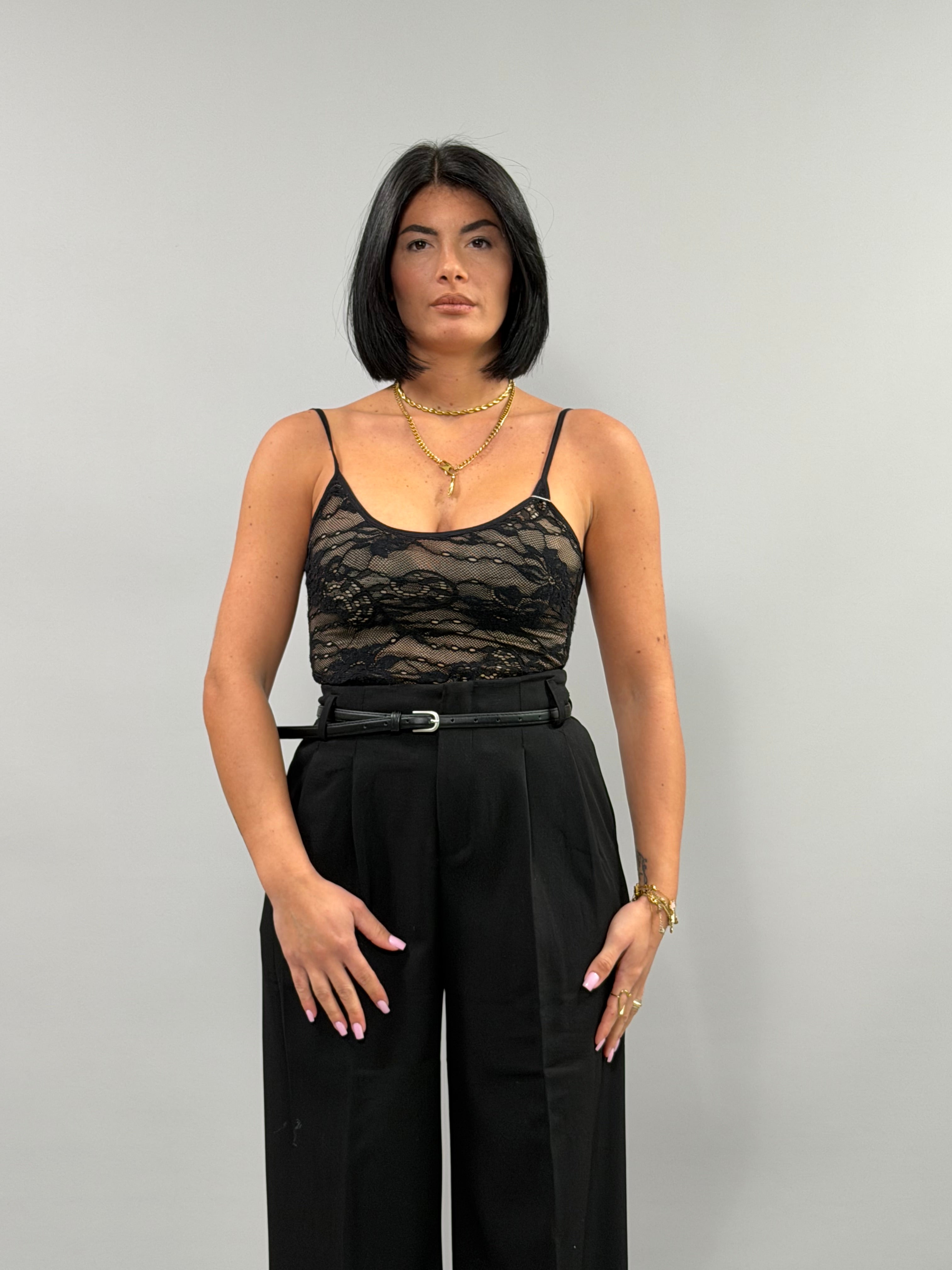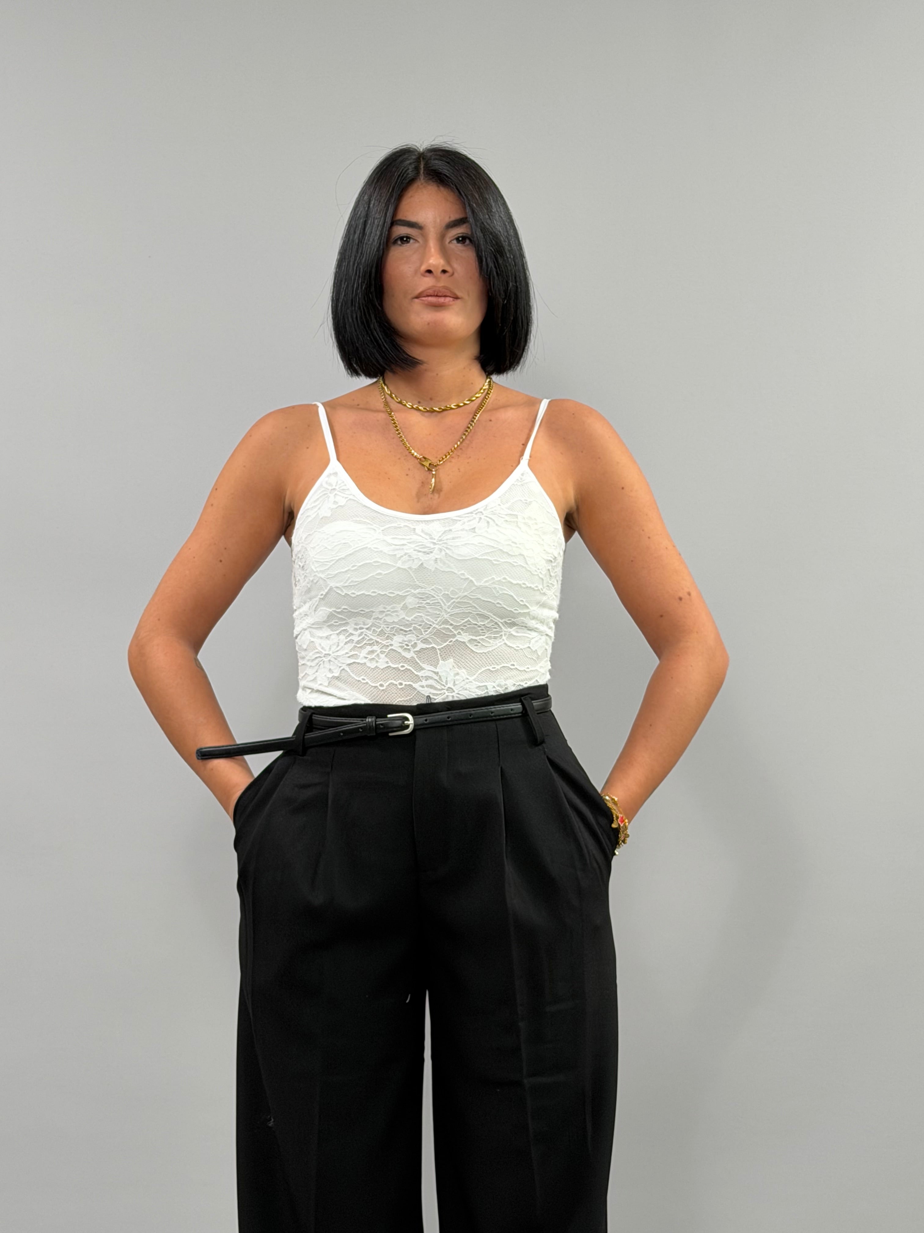 Il Body Chantal è disponibile nei colori beige, bianco e nero, ed è realizzato in taglia unica, adattabile a diverse conformazioni. La sua vestibilità è studiata per offrire comfort e sostegno, risultando ideale per una varietà di stili e occasioni. La modella, alta 168 cm, mostra come il design si adatti armoniosamente al corpo.