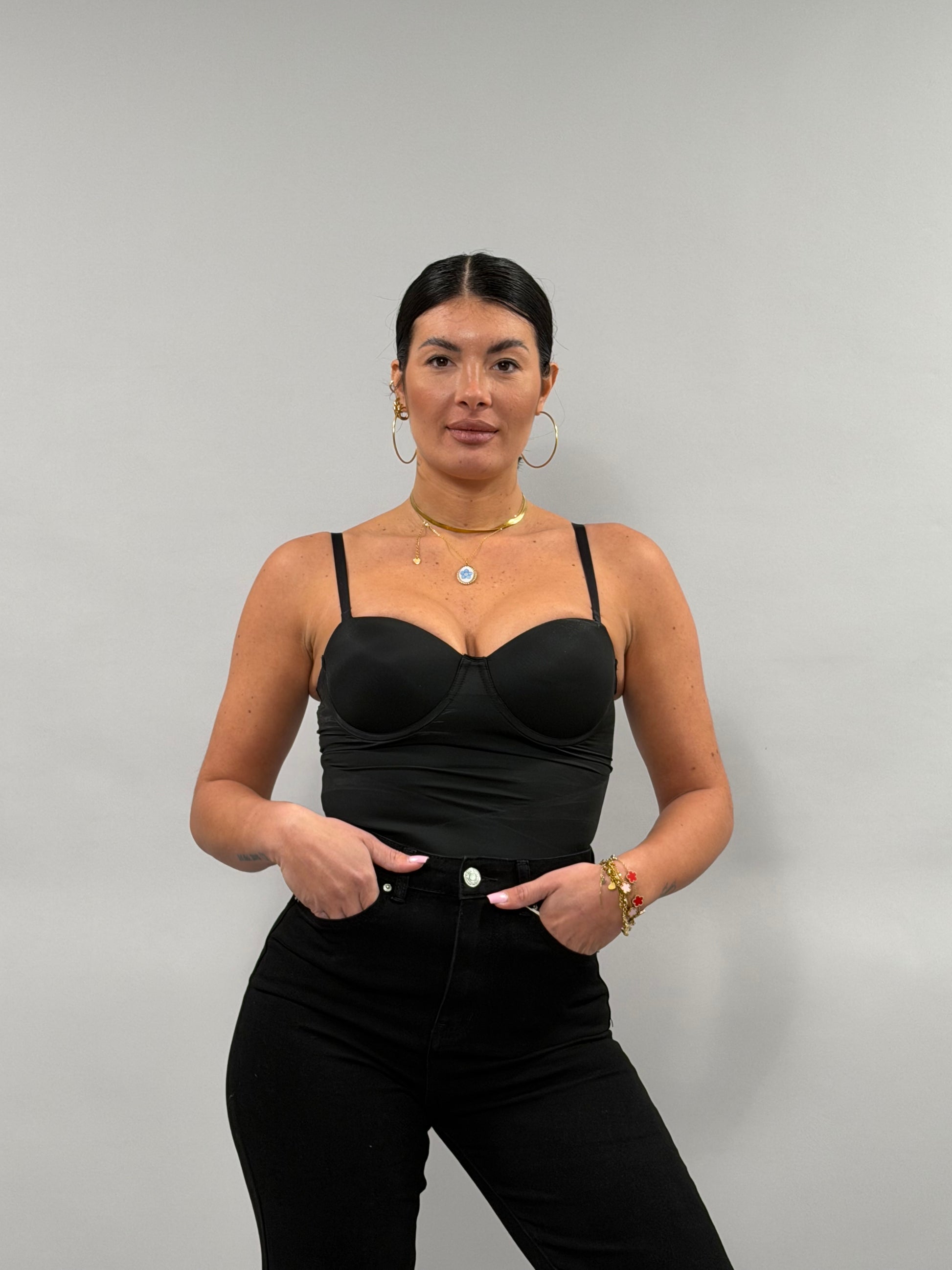 Il Body Sandra è disponibile nelle eleganti varianti nero e bianco, nelle taglie S e M. Progettato per una vestibilità precisa, il modello in taglia S è indossato da una modella alta 168 cm, evidenziando la sua capacità di adattarsi a diverse silhouette, garantendo comfort e stile.