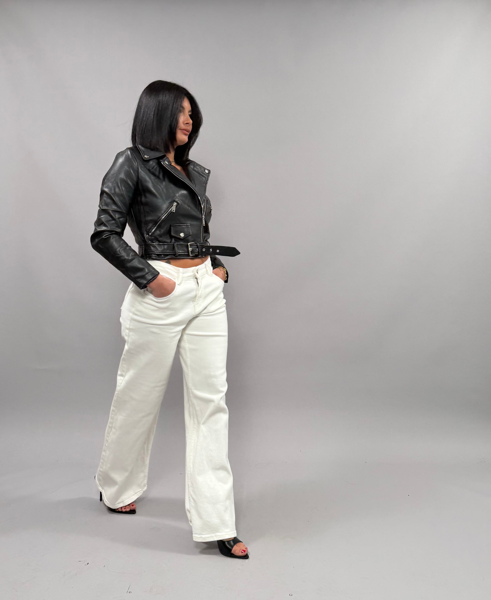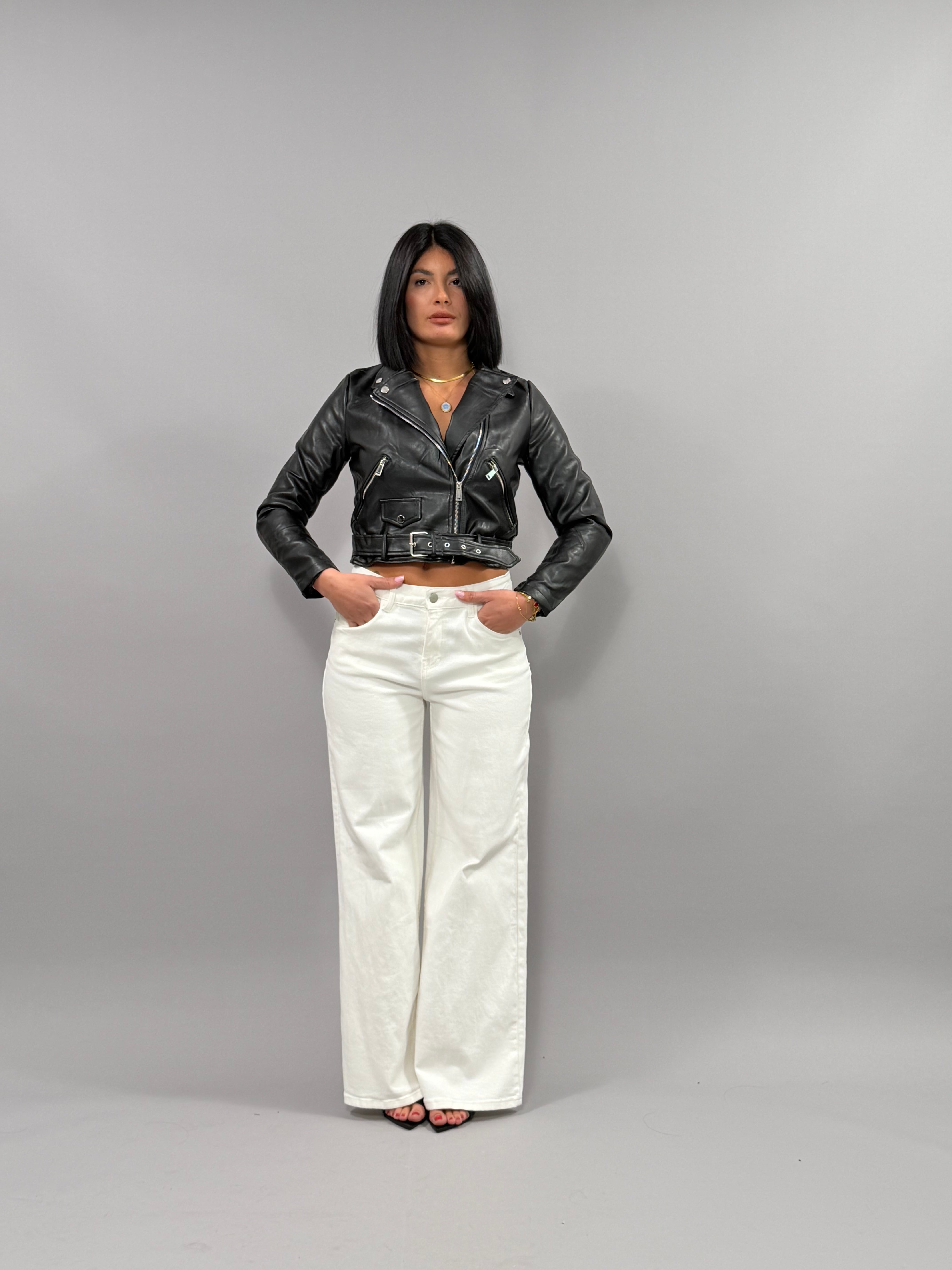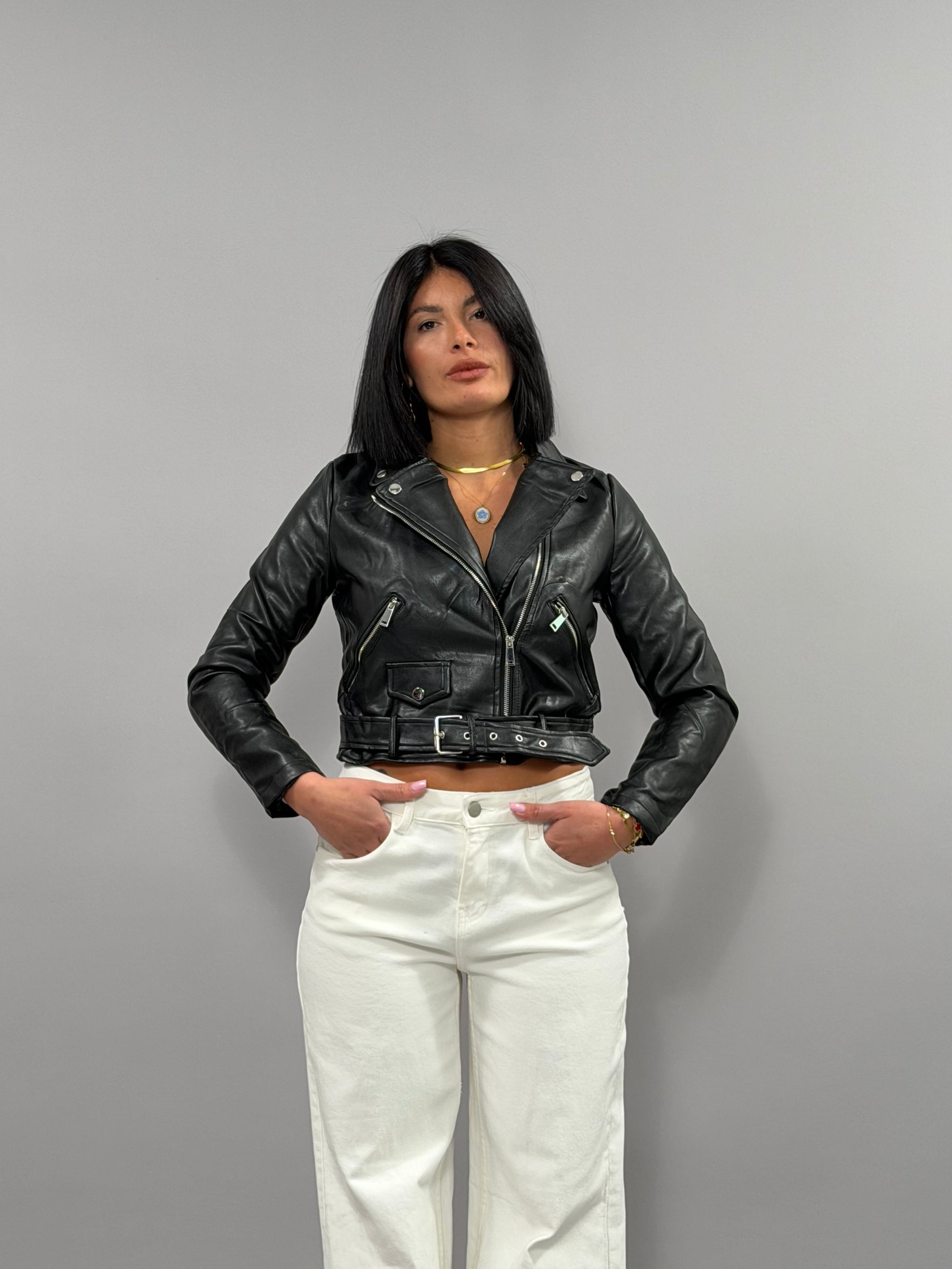 Il Chiodo Ary è un giubbotto in ecopelle disponibile nelle taglie S, M e L. La modella indossa una taglia S e ha un'altezza di 168 cm, il che evidenzia la vestibilità elegante e moderna del capo. Realizzato con materiali sostenibili, offre una combinazione di stile e rispetto per l'ambiente.