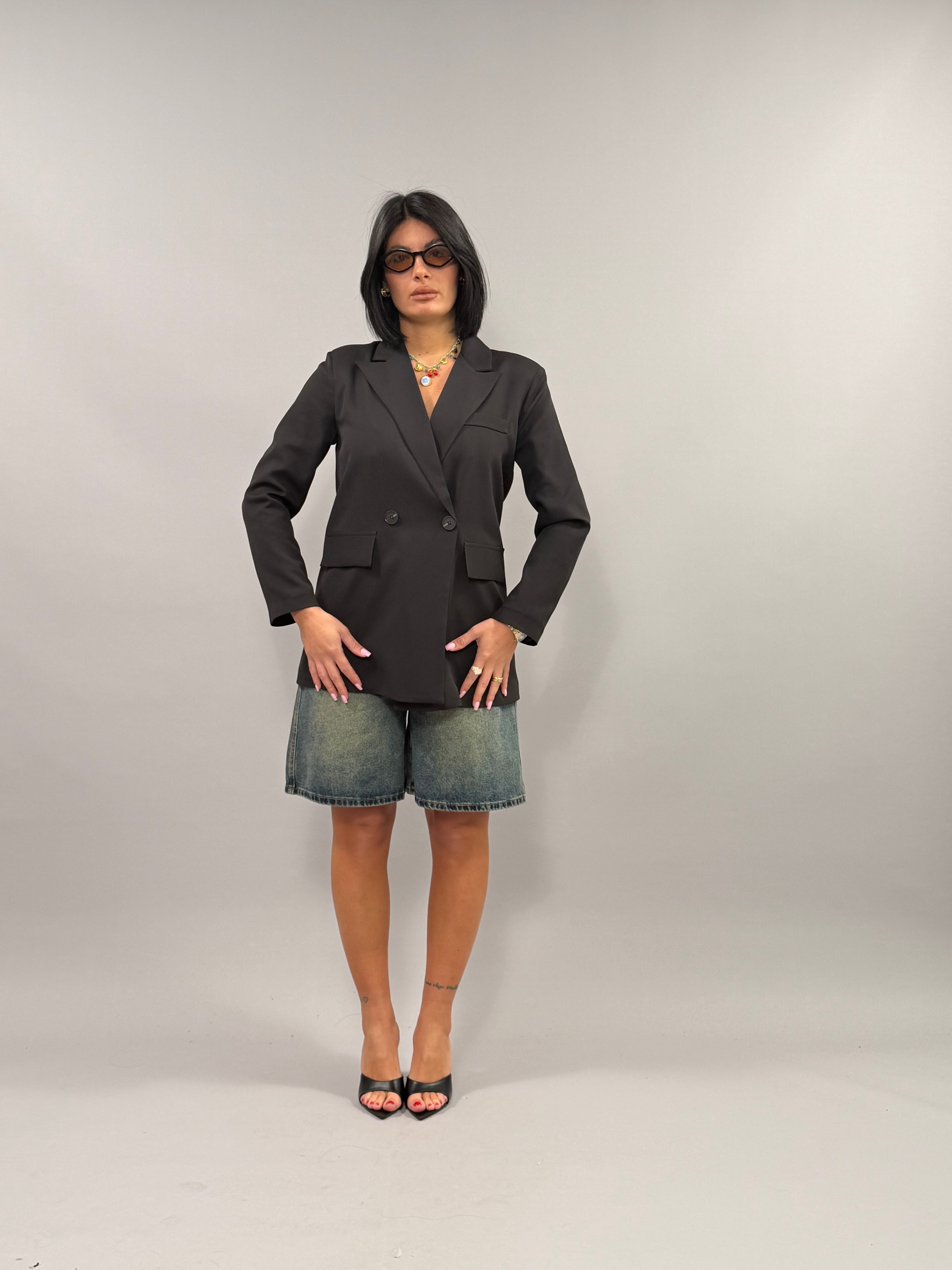 La Giacca Arisa è disponibile in due eleganti colori, nero e azzurro, in taglia unica, progettata per adattarsi a diverse corporature. La giacca offre un fit versatile, ideale per varie occasioni, grazie alla sua lunghezza e al design studiato. La modella, alta 168 cm, evidenzia come il taglio di questa giacca renda l'abbigliamento elegante e funzionale.
