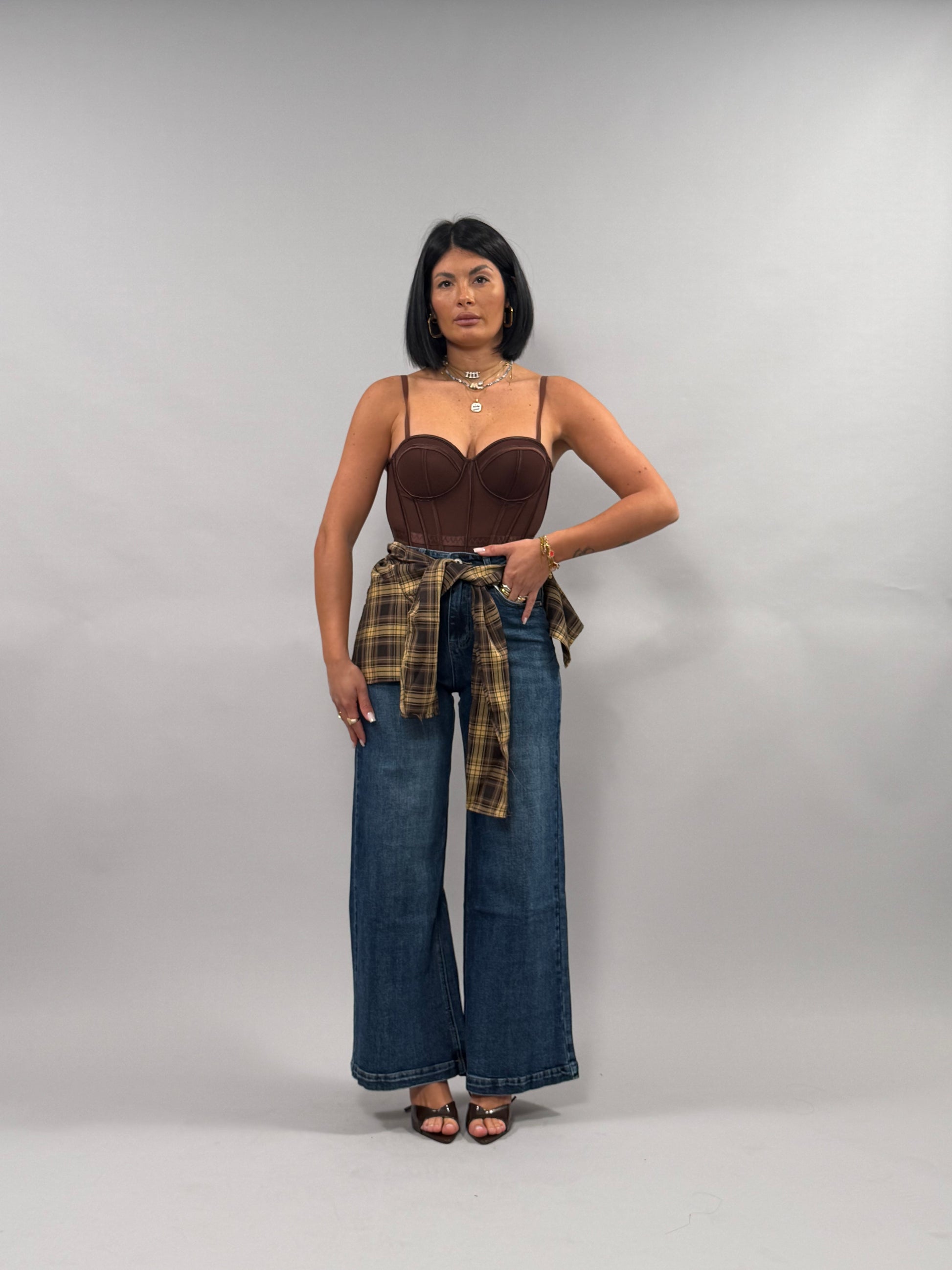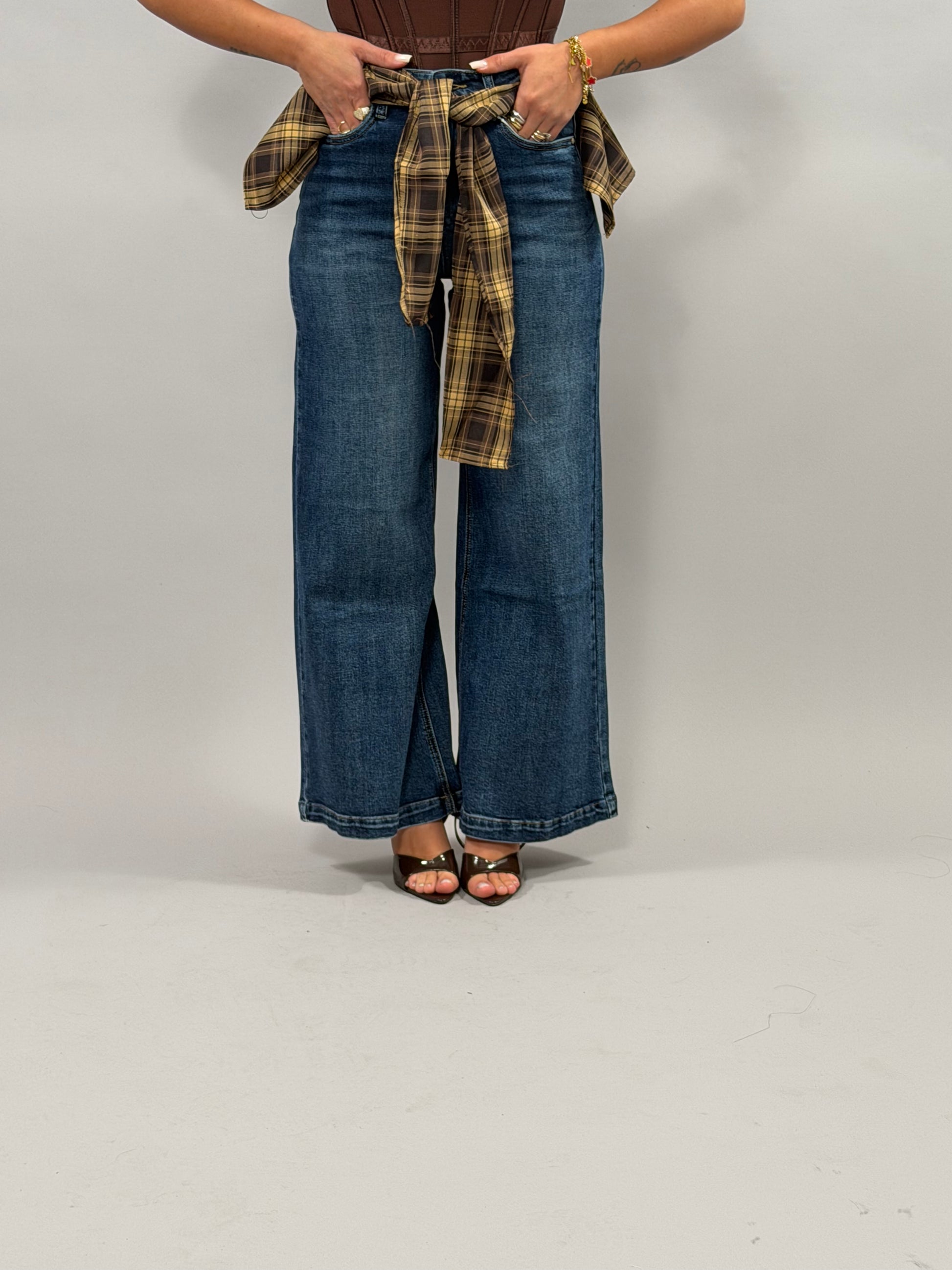 I jeans Fulard presentano un design elegante con un fulard a quadri marrone, disponibili nelle taglie da XS a L. La modella, alta 168 cm, indossa una taglia S, garantendo una vestibilità versatile. Questi jeans combinano comfort e stile, adatti per varie occasioni.