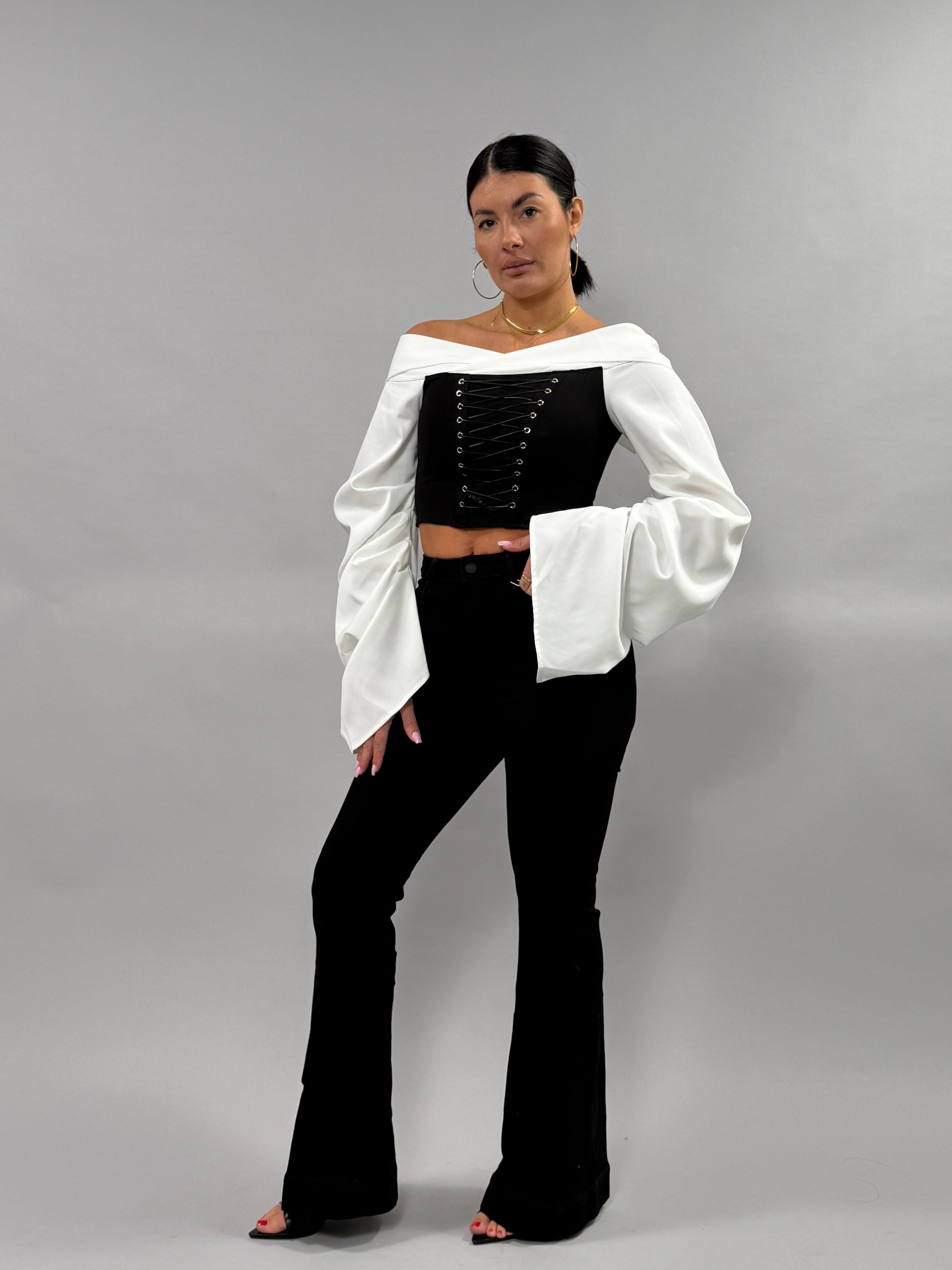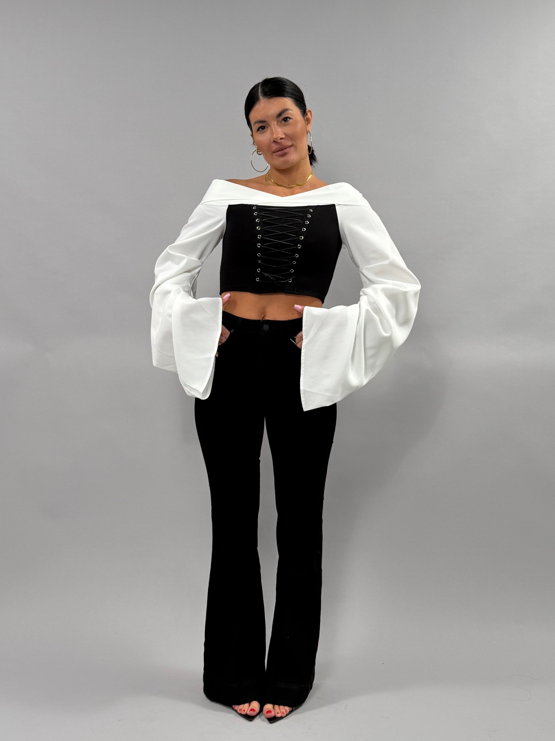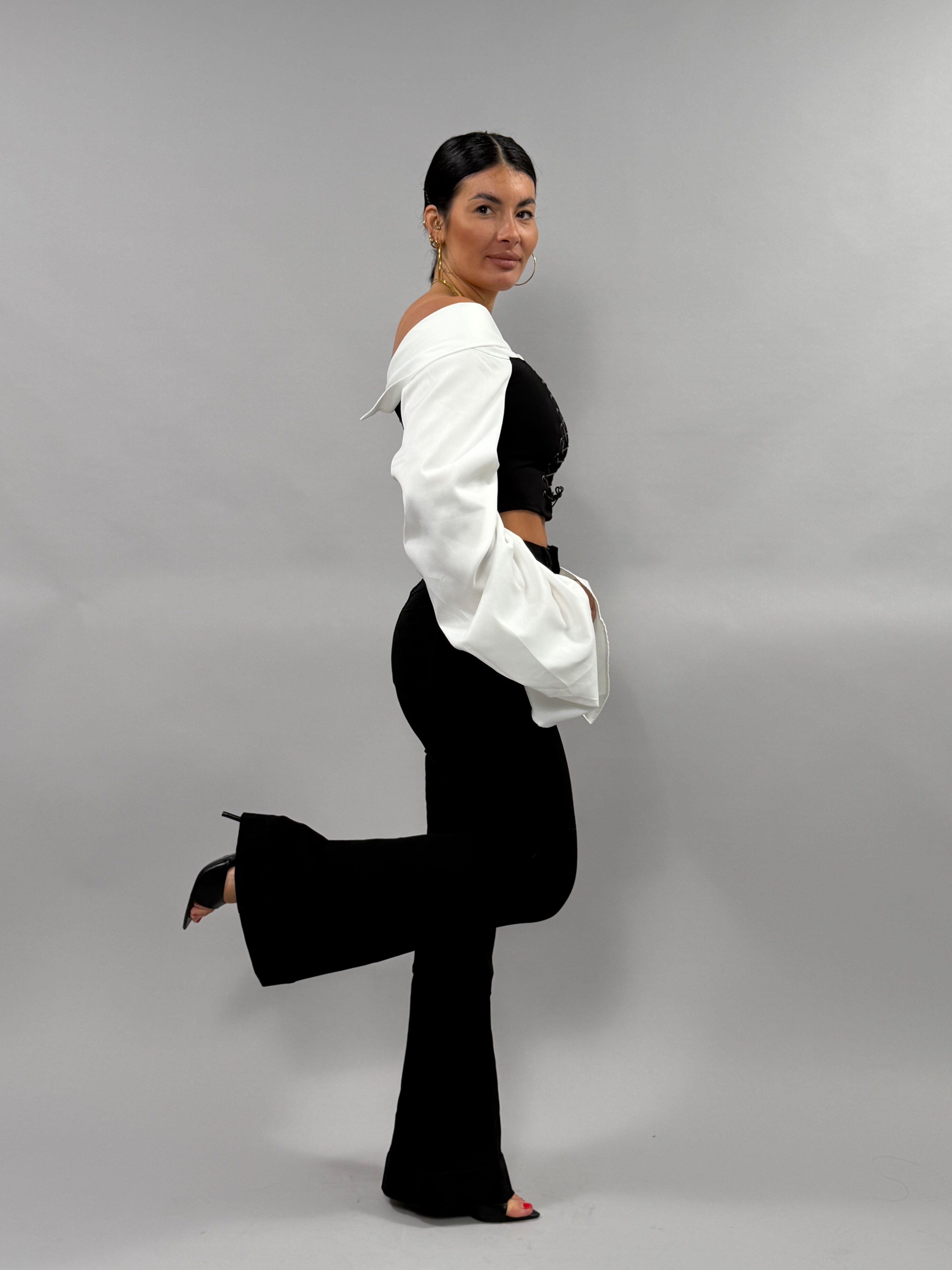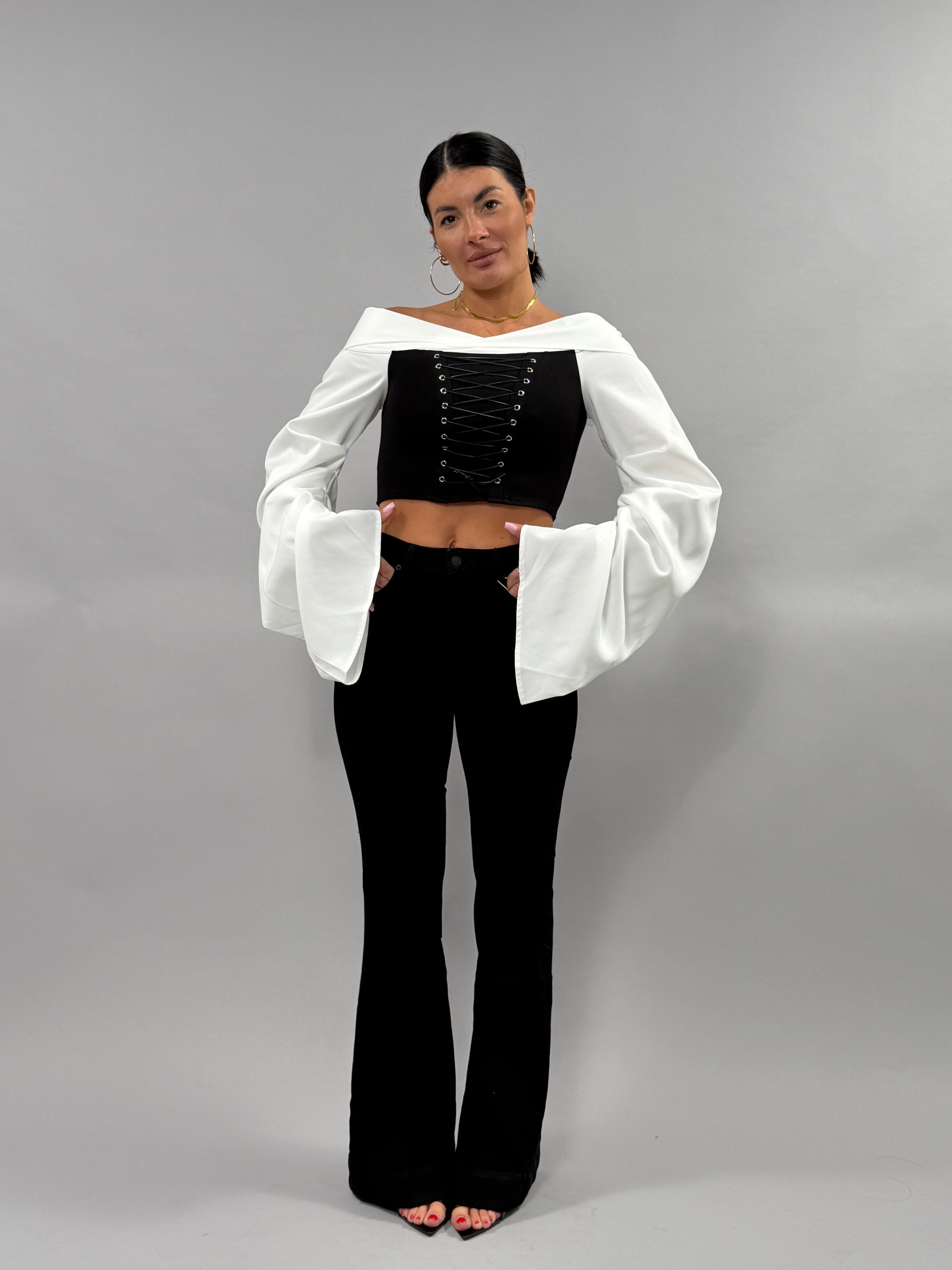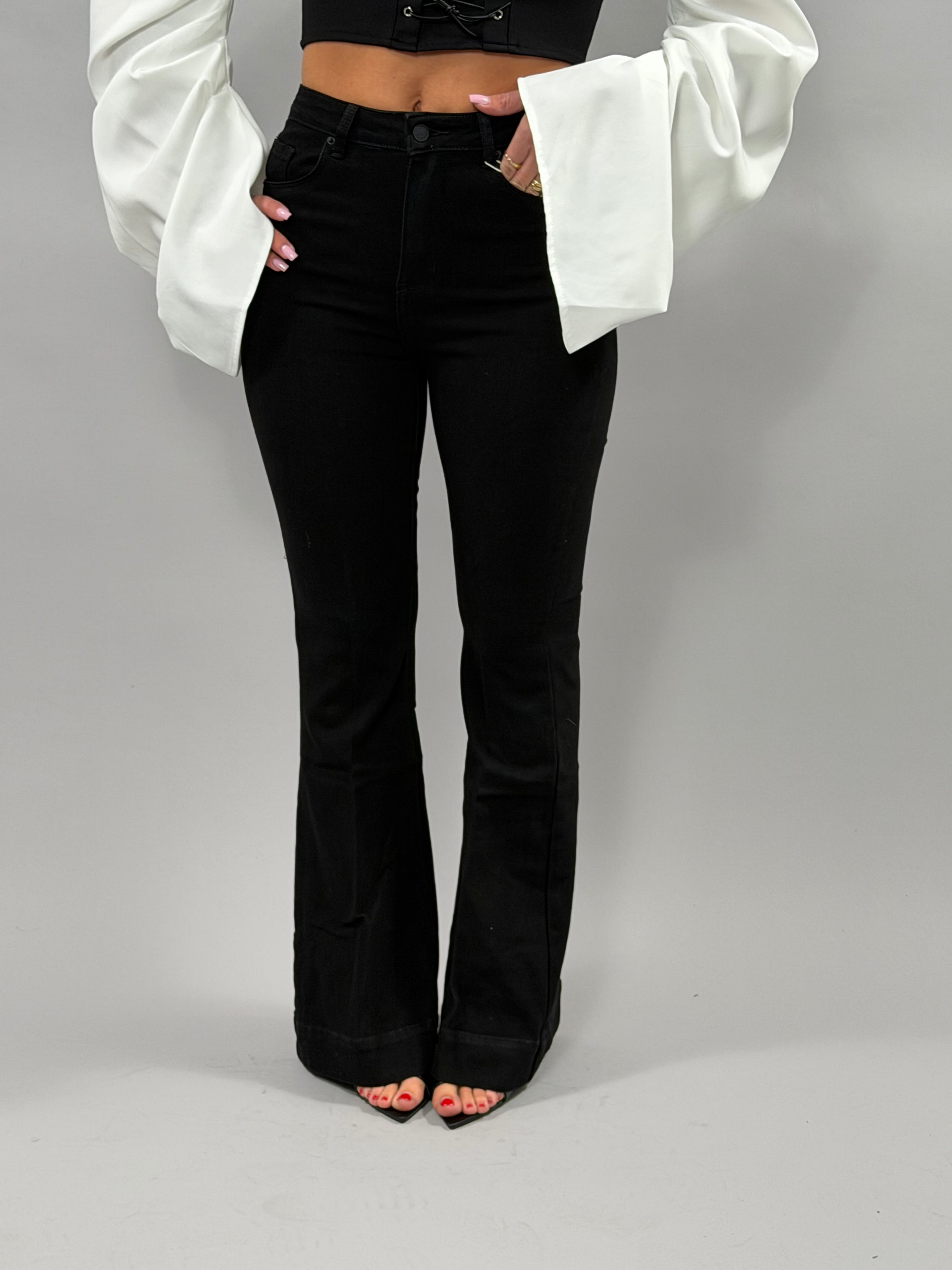 I Jeans Susy a zampa sono disponibili in colore nero e coprono una gamma di taglie da XS a XL. La modella indossa una taglia S ed è alta 168 cm, evidenziando la versatilità e l'adattabilità del prodotto. Questi jeans offrono una vestibilità che si adatta a diverse forme del corpo, garantendo comfort e stile.